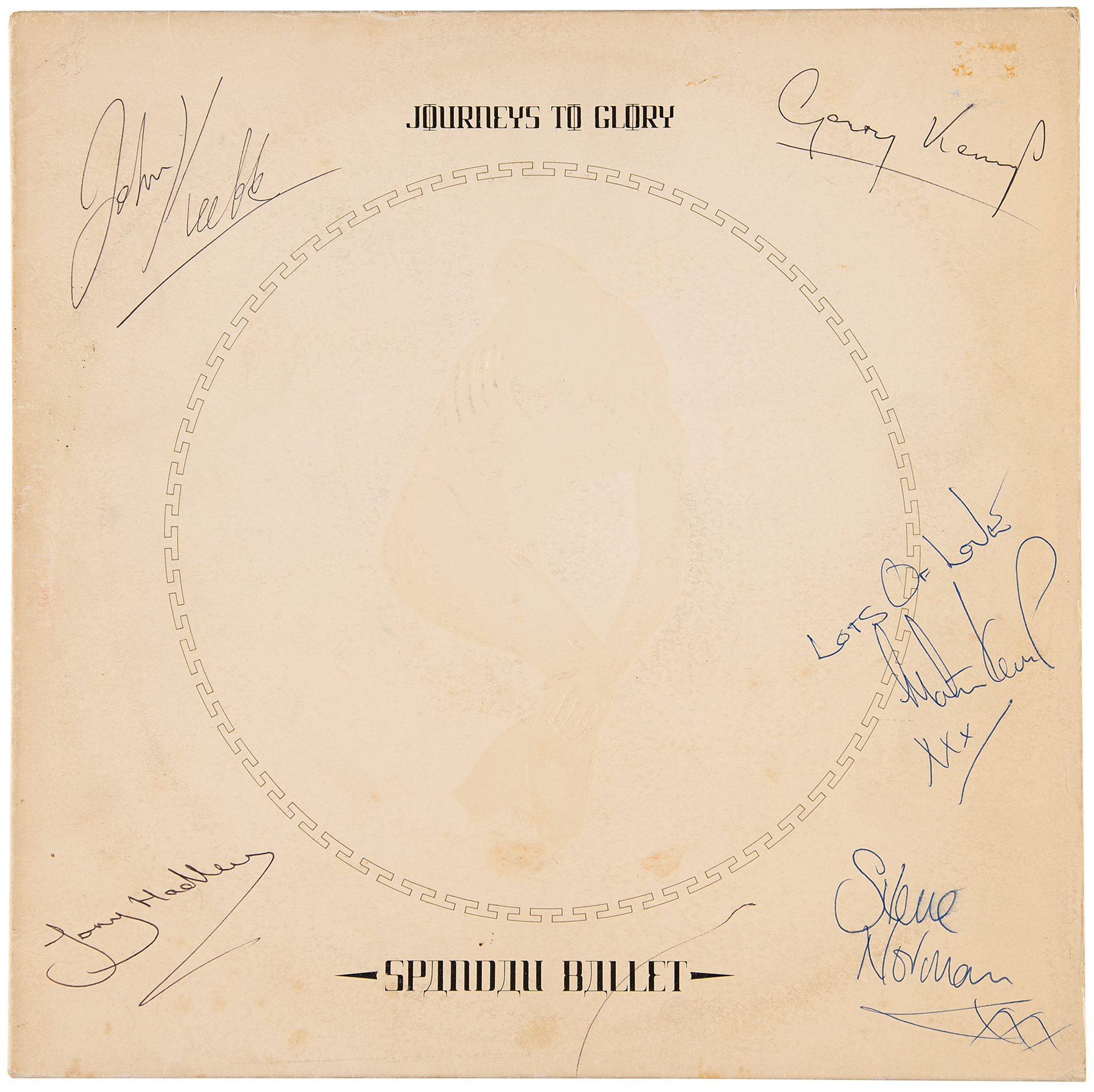 Journeys to Glory album Spandau Ballet, signed on the front cover in black and blue ballpoint by the original lineup of Tony Hadley, Gary Kemp, Steve Norman, Martin Kemp, and John Keeble. In fine condition, with light scuffing and some small stains. The record is not included.