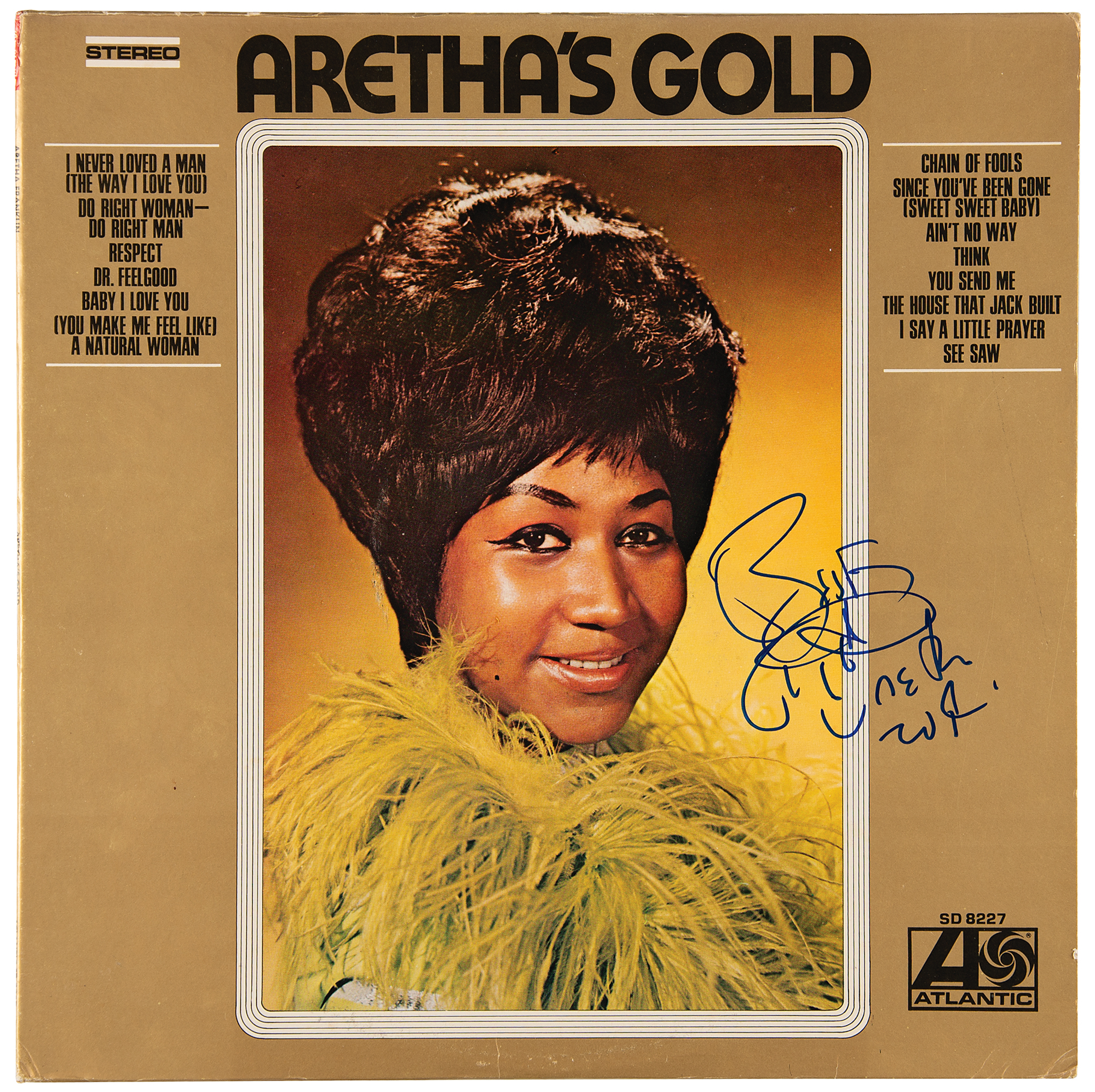 Aretha's Gold compilation album, signed on the front cover in blue felt tip, "Best Aretha," who adds a smiley face. In fine condition. The record is not included.