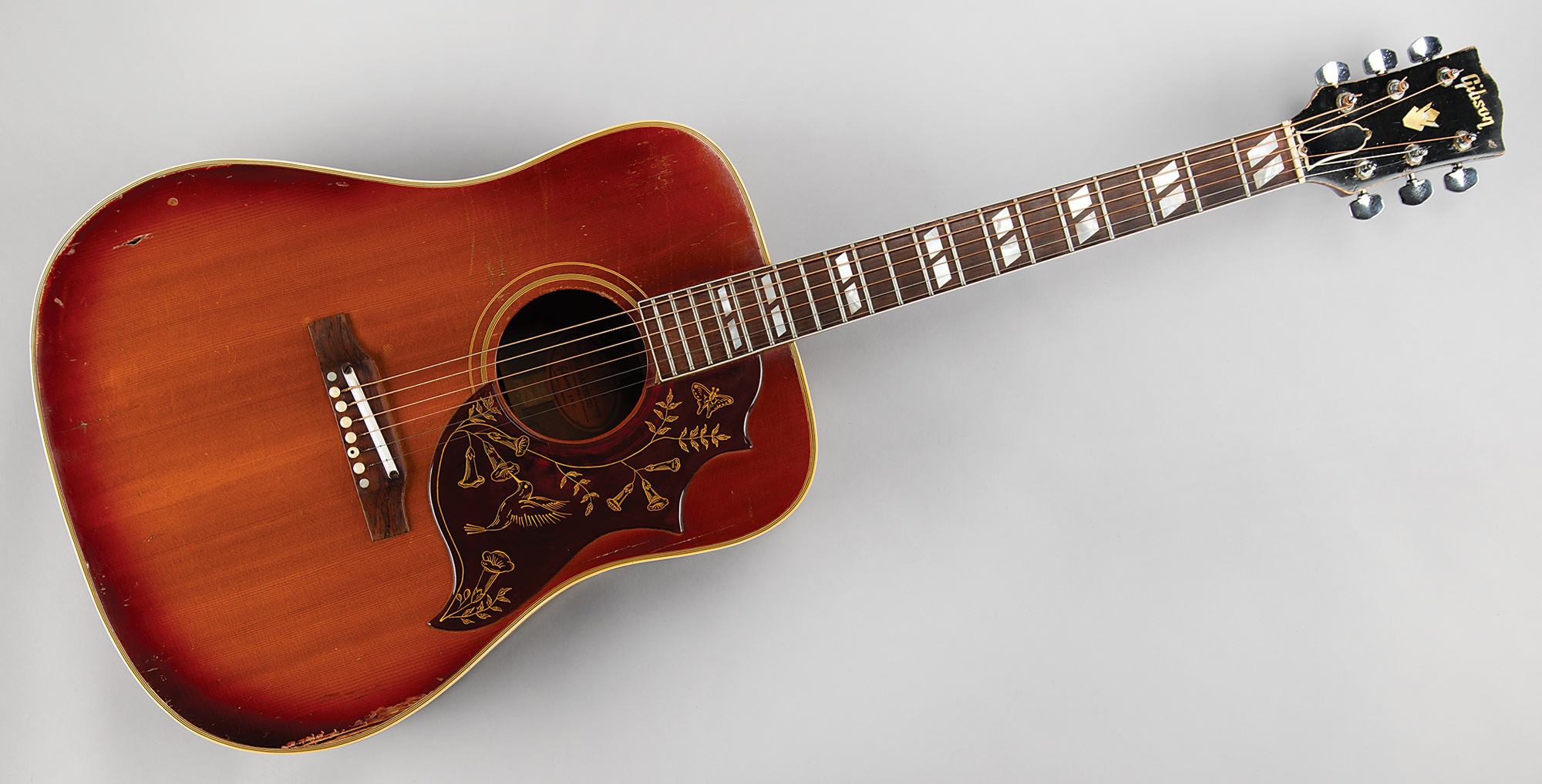 One would imagine that this Gibson Hummingbird—clearly well-traveled and played often—went along for the ride.