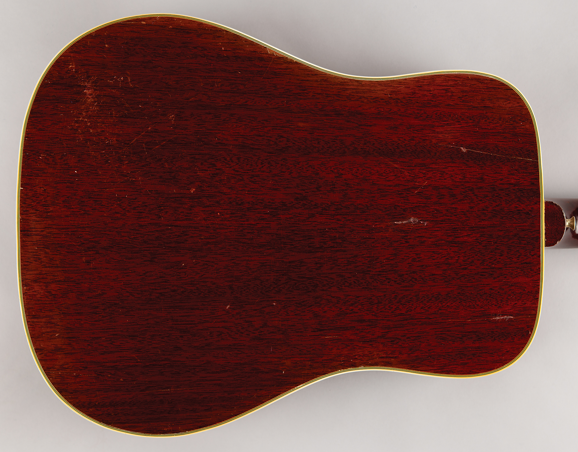 This historically important to the evolution of folk and rock, first official year of production, 1961, Hummingbird owned by Bob Neuwirth, exhibits a fine-grained Sitka spruce X-braced top sporting a cherry-red sunburst finish with Honduras mahogany back and sides, a one-piece 20 fret Honduras mahogany neck with a crown inlay on the headstock face, a Brazilian Rosewood bridge with an original adjustable bridge saddle, and a beautiful ornate pickguard adorned with a hummingbird hovering near blossoms, vines, and a flitting butterfly.