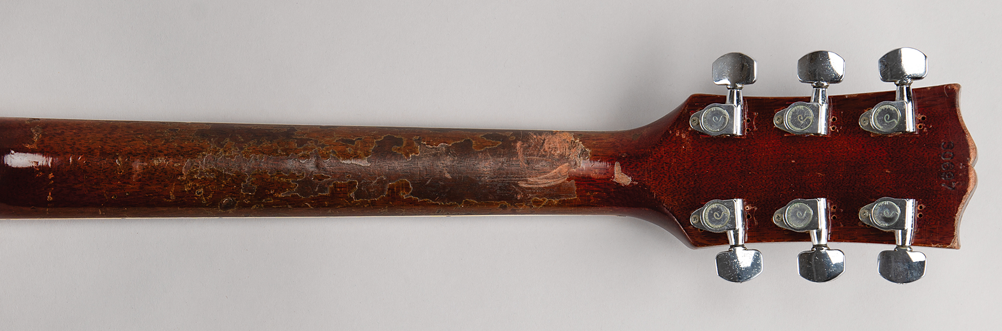 This guitar’s classic '61 slim tapered neck allows for fast, low action and is very comfortable to play. The bound rosewood fingerboard with large parallel pearl inlays shows years of honest playing wear front and back. The back on the neck, in particular behind the first, second, and third frets, show years of wear from playing and heavy capo usage.