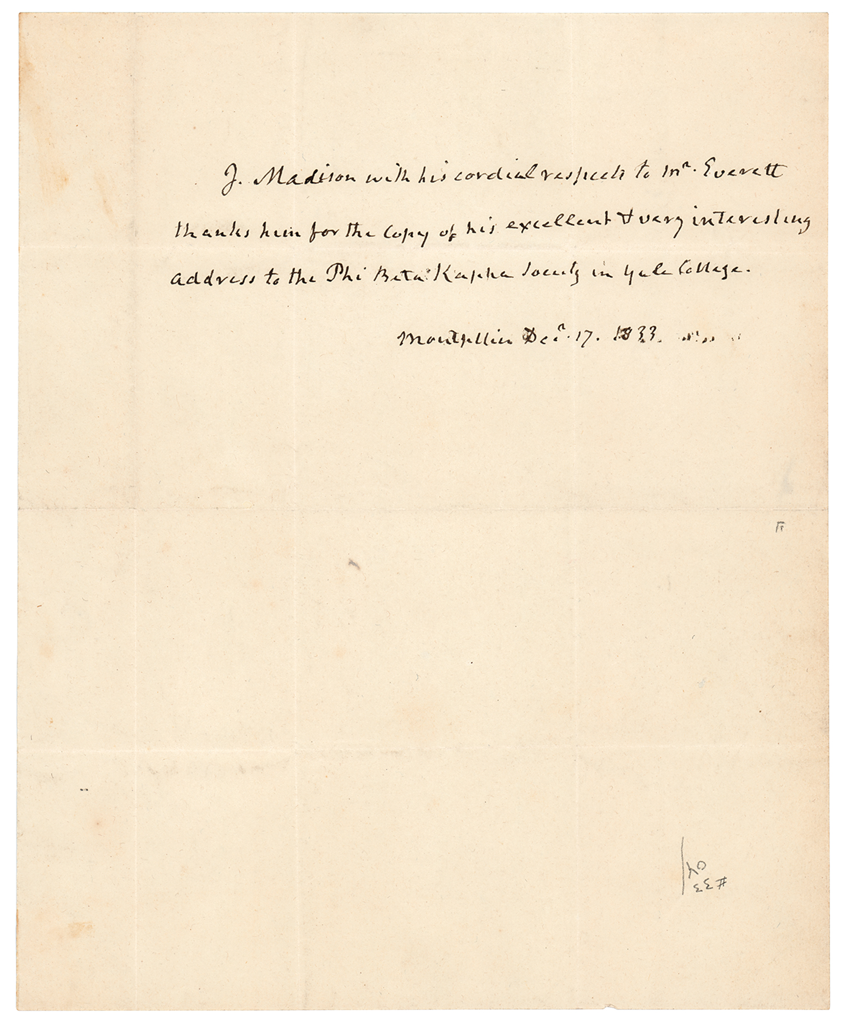 Third-person ALS signed within the text, “J. Madison,” one page, 8 x 9.75, December 17, 1833. Handwritten letter from his Montpelier estate, in full: "J. Madison with his cordial respects to Mr. Everett thanks him for the copy of his excellent & very interesting address to the Phi Beta Kappa Society in Yale College." In fine condition. A desirable, boldly penned letter by the influential founding father.