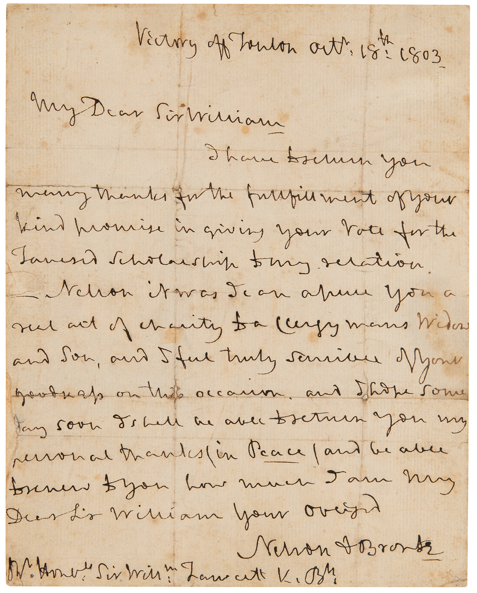 ALS signed "Nelson & Bronte," one page, 7.25 x 9, October 18, 1803. Handwritten letter of thanks to Sir William Fawcett, penned while aboard HMS Victory "off Toulon." In part: "I have to return you many thanks for the fulfillment of your kind promise in giving your vote for the…Scholarship to my relation. Nelson it was I can assure you a real act of charity to a clergy man's Widow and son, and I feel truly sensible of your goodness on the occasion and I hope someday soon I shall be able to return you my personal thanks (in peace) and be able to show to you how much I am Desr Sir William your obd svt." Affixed to a same-size sheet and in very good to fine condition, with scattered light staining, and repairs to complete separations along intersecting folds.