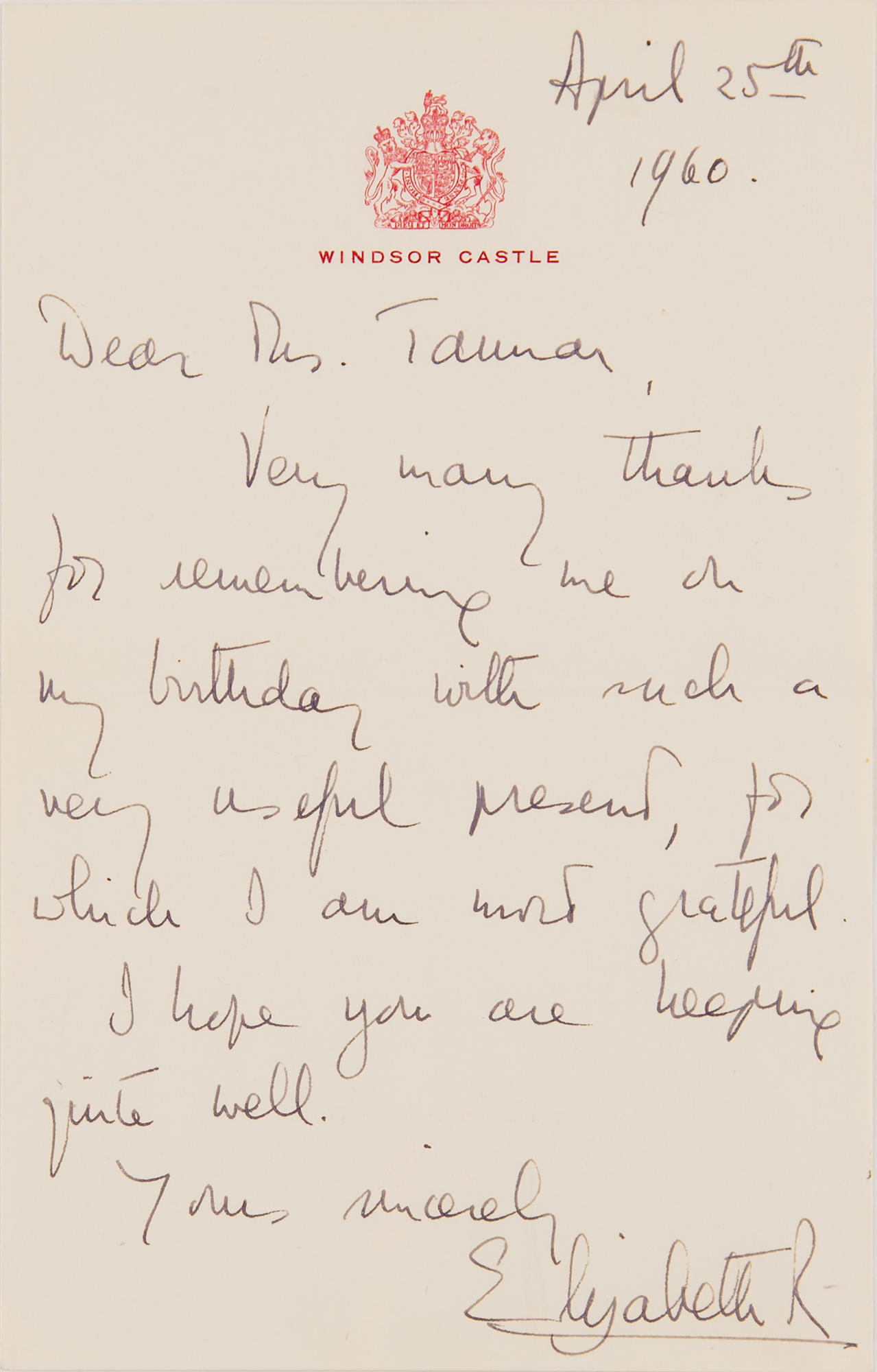 ALS signed “Elizabeth R,” one page, 4.75 x 7.5, Windsor Castle letterhead, April 25, 1960. Handwritten letter to "Mrs. Tannar" at Rose Cottage, in full: "Very many thanks for remembering me on my birthday with such a very useful present, for which I am most grateful. I hope you are keeping quite well." In fine condition. Accompanied by the original mailing envelope, addressed in Queen Elizabeth's hand and initialed in the lower left, "ER."