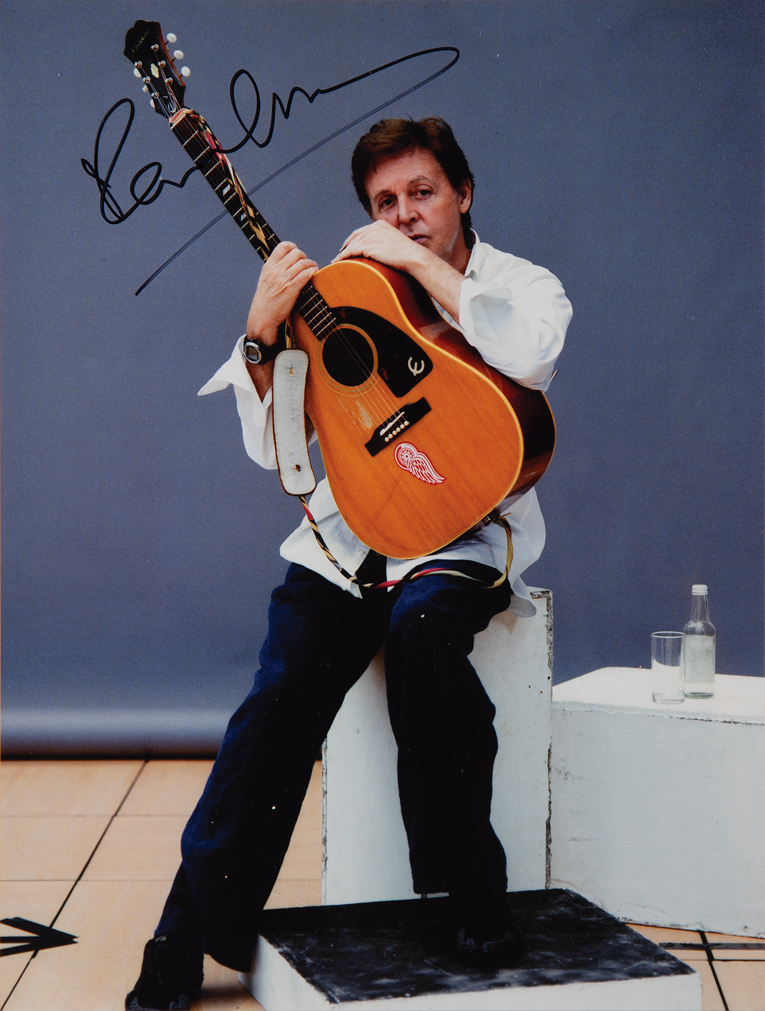 Color glossy 8 x 10.75 photo of Paul McCartney posing with his Epiphone Texan acoustic guitar, signed in black felt tip. A note affixed to the reverse indicates that the autograph was obtained in person at Hotel Bristol, Paris, in December 2009. In fine condition.