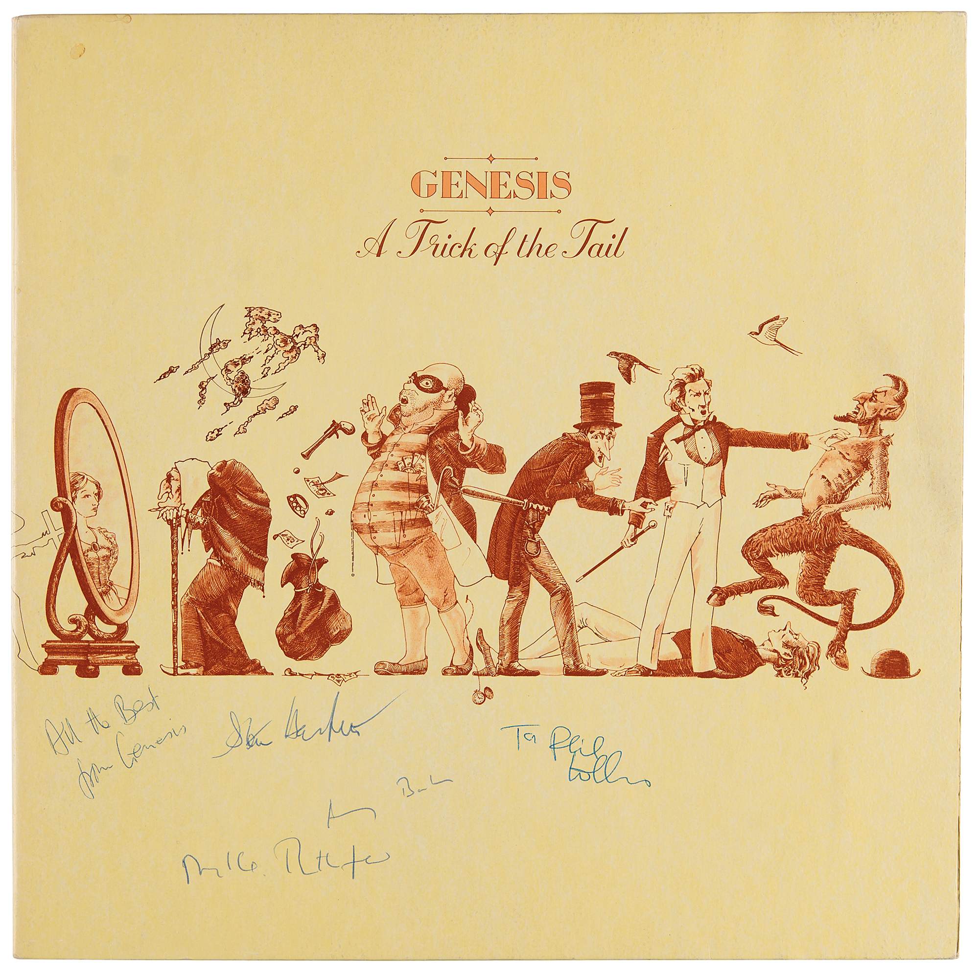 UK vinyl pressing of the 1976 Genesis album A Trick of the Tail, signed on the front cover in ballpoint by Phil Collins, Anthony Banks, Mike Rutherford, and Steve Hackett, with one member adding “All the best from Genesis.” The consignor notes that the signatures date to the 1970s. In fine condition. The record is included. Accompanied by a certificate of authenticity from Tracks.