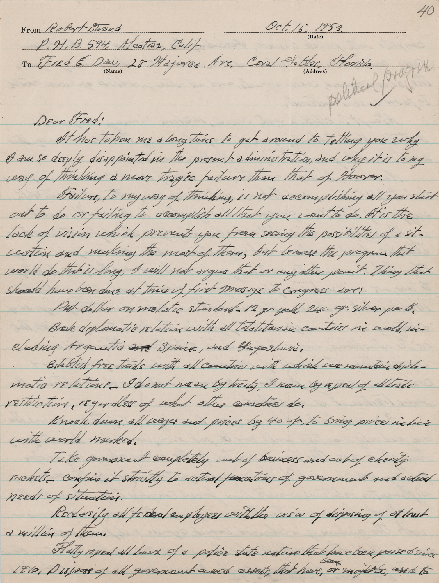 ALS signed “Bob, Robert Stroud #594,” one page, both sides, 8 x 10.5, Alcatraz prison stationery to which he adds his full name and prison address, October 15, 1953. Handwritten letter to Fred E. Daw, his longtime friend and the president of the Chicago Bird Club, stating his displeasure with the administration of Dwight D. Eisenhower and listing several ways in which America could improve. In part: “It has taken me a long time to get around to telling you why I am so deeply disappointed in the present administration and why it is to my way of thinking a more tragic failure than that of Hoover.”