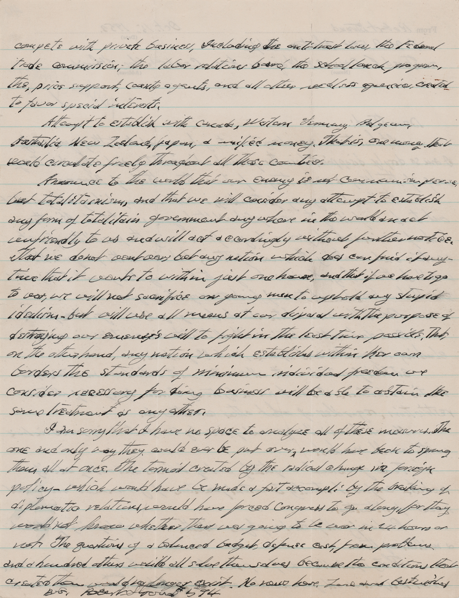 Stroud proceeds to list topics that “should have been done at time of first message to Congress,” which include: “Break diplomatic relation with all totalitarian countries in world, including Argentina, Spain and Yugoslavia,” “Knock down all wages and prices by 40% to bring price in line with world market,” “Take government completely out of business and out of charity rackets, confine it strictly to actual functions of government and actual needs of situations,” “Reclassify all federal employees with the view of disposing of at least a million of them,” and “Announce to the world that our enemy is not communism per se but totalitarianism, and that we will consider any attempt to establish any form of totalitarian government anywhere in the world an act unfriendly to us and will act accordingly without further notice.” In fine condition.