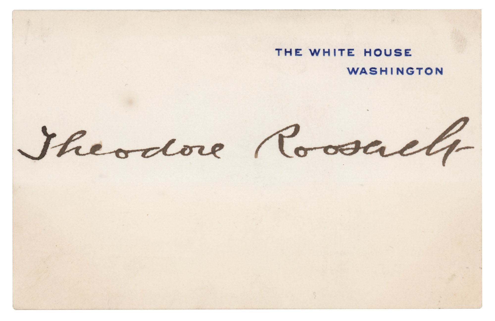 Sought-after White House card, 4 x 2.75, boldly signed in ink by President Theodore Roosevelt. In fine condition, with faint toning and two trivial spots.