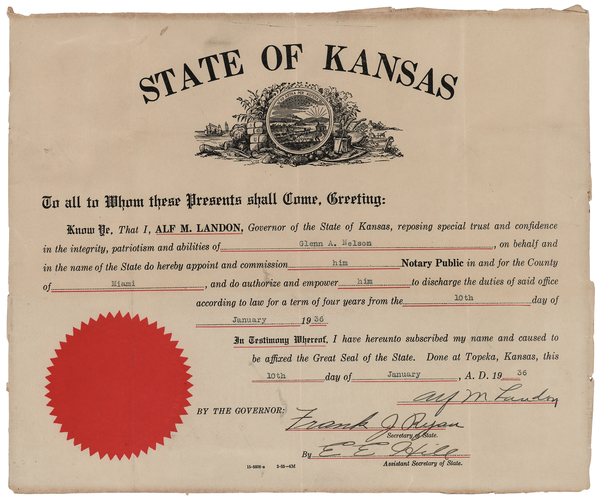 American oilman and politician (1887–1987) who served as governor of Kansas from 1933 to 1937; the Republican Party's presidential nominee in 1936, he lost in a landslide to incumbent Franklin D. Roosevelt. Partly-printed DS, signed “Alf M. Landon,” one page, 12 x 10, January 10, 1936. As governor of Kansas, Landon appoints Glenn A. Nelson as a "Notary Public in and for the County of Miami." Signed at the conclusion in fountain pen by Governor Alf Landon, Secretary of State Frank J. Ryan, and Assistant Secretary of State E. E. Hill. The red seal affixed at the lower left remains intact. In very good to fine condition, with intersecting folds and light edge wear.