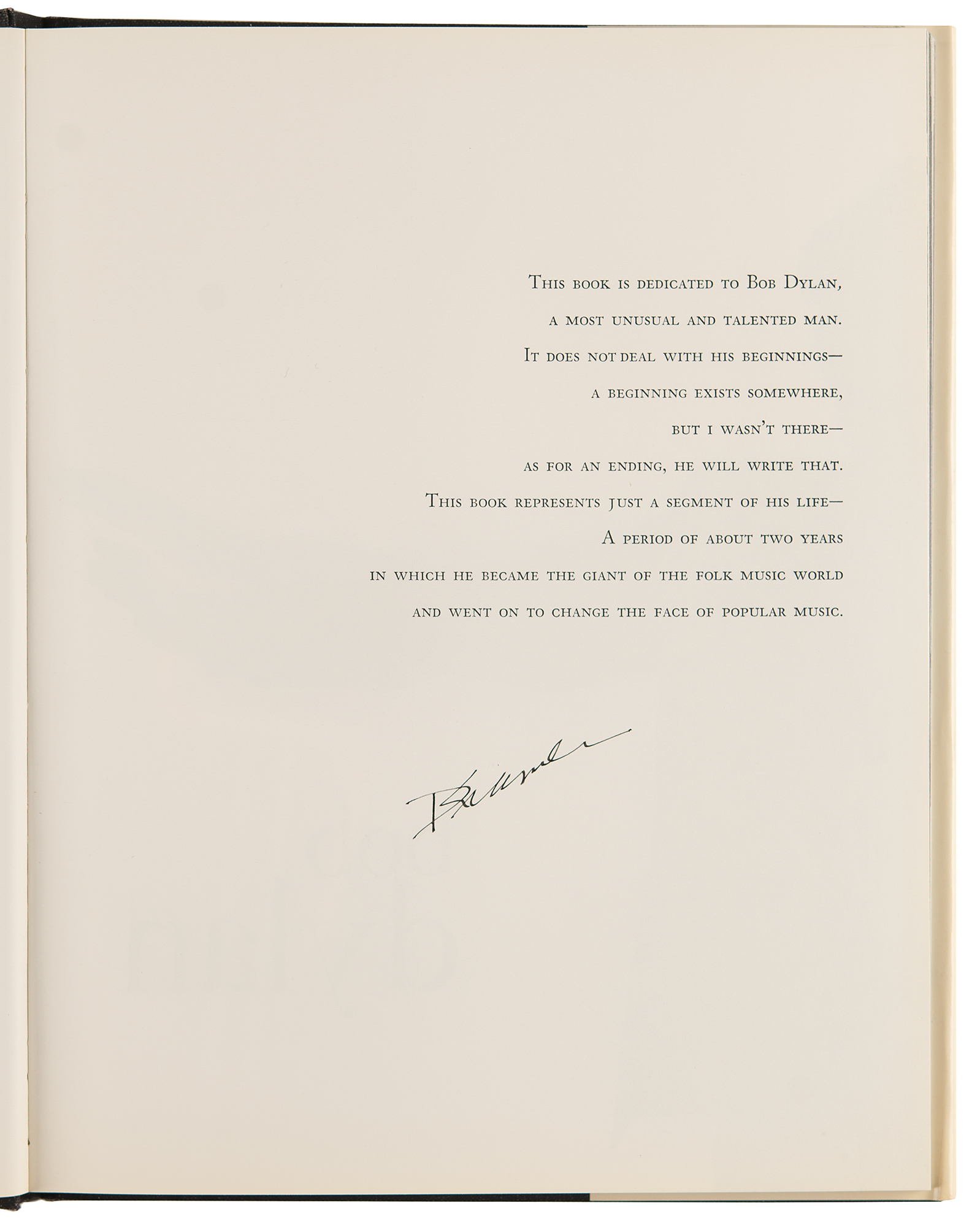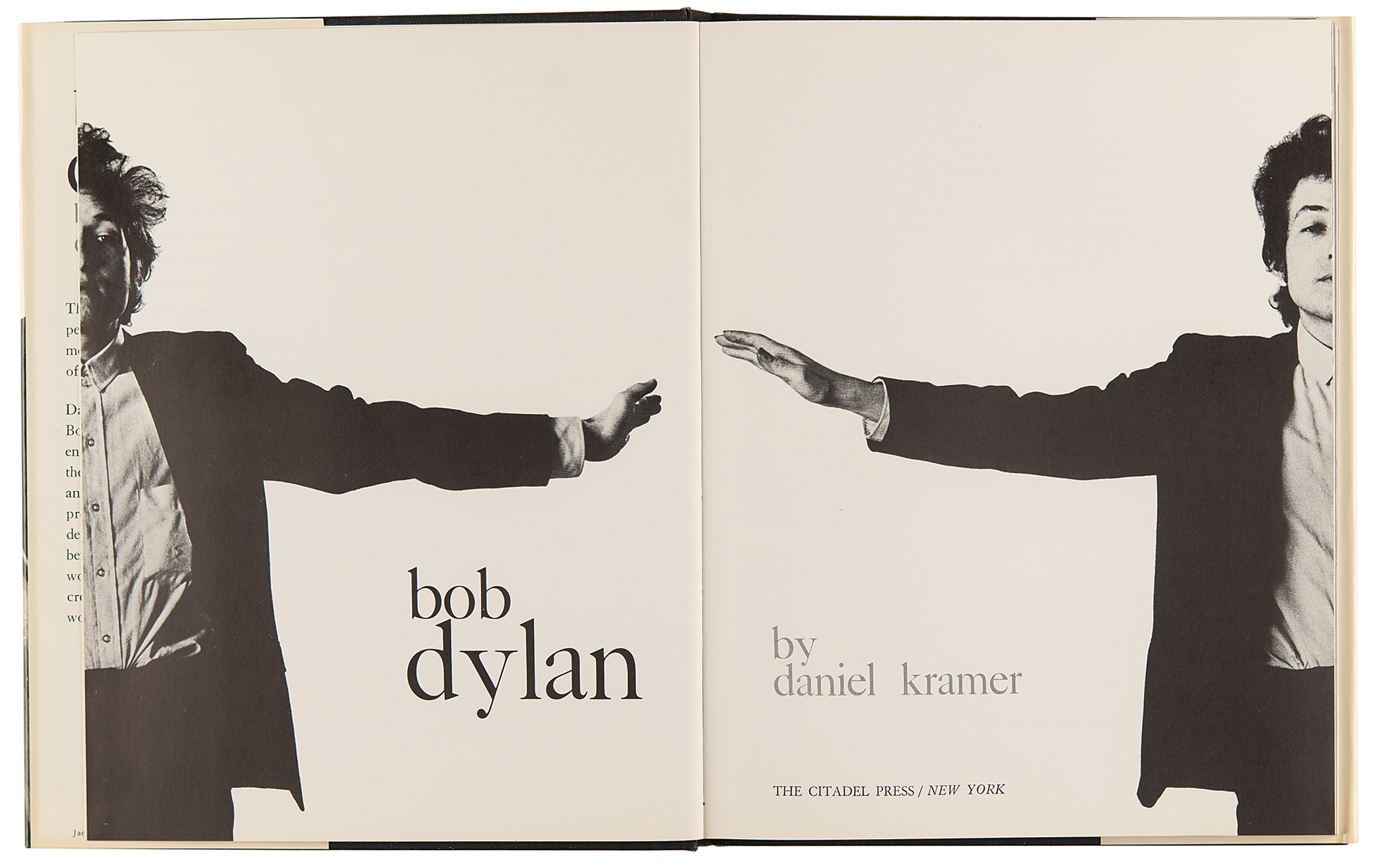 Signed book: Bob Dylan by Daniel Kramer. First edition. NY: The Citadel Press, 1967. Hardcover with dust jacket, 8.75 x 11, 159 pages. Neatly signed on a prefatory page in black felt tip by the author/photographer, "D. Kramer." In fine condition, with a tiny tear to the top edge of the dust jacket.