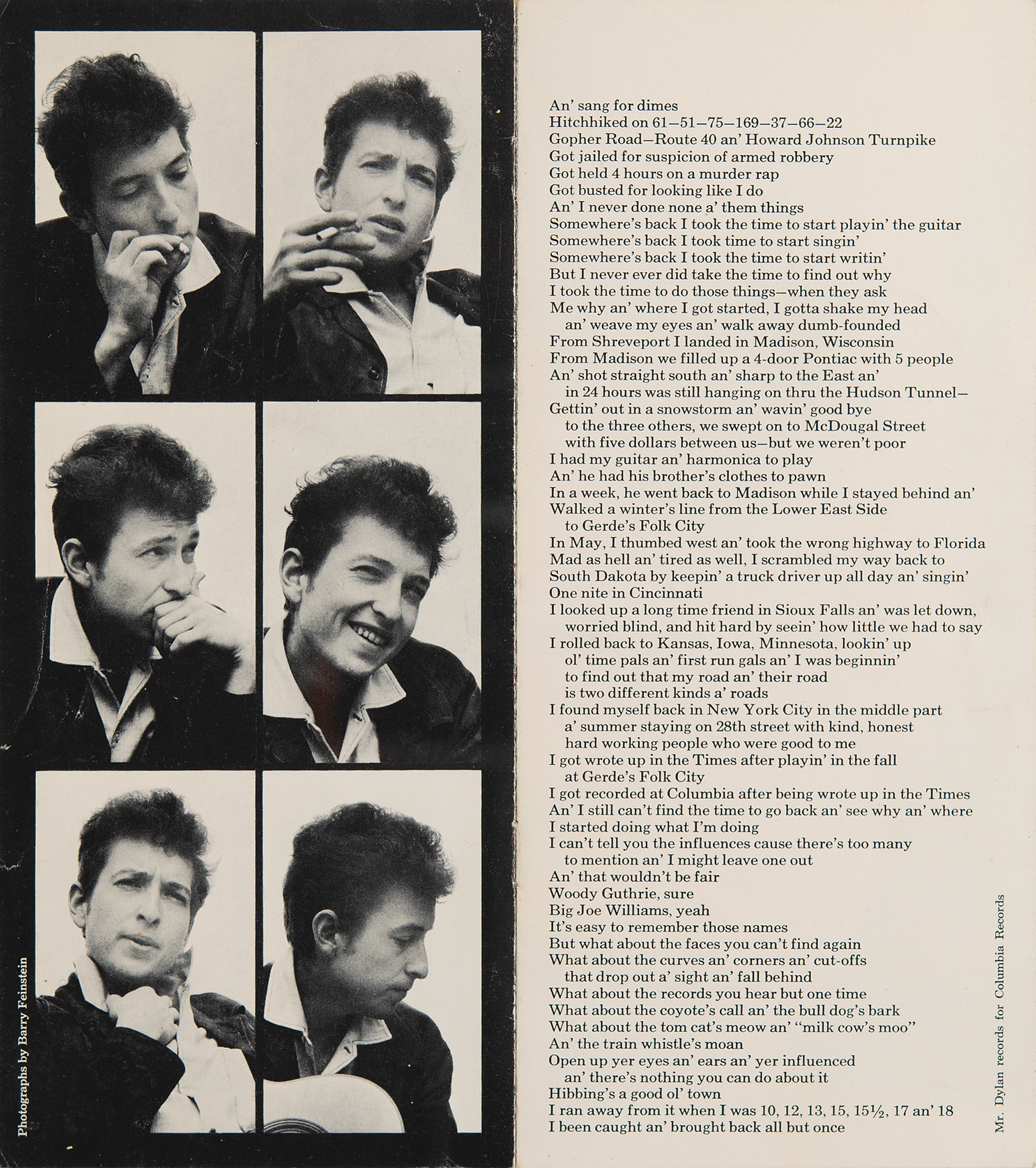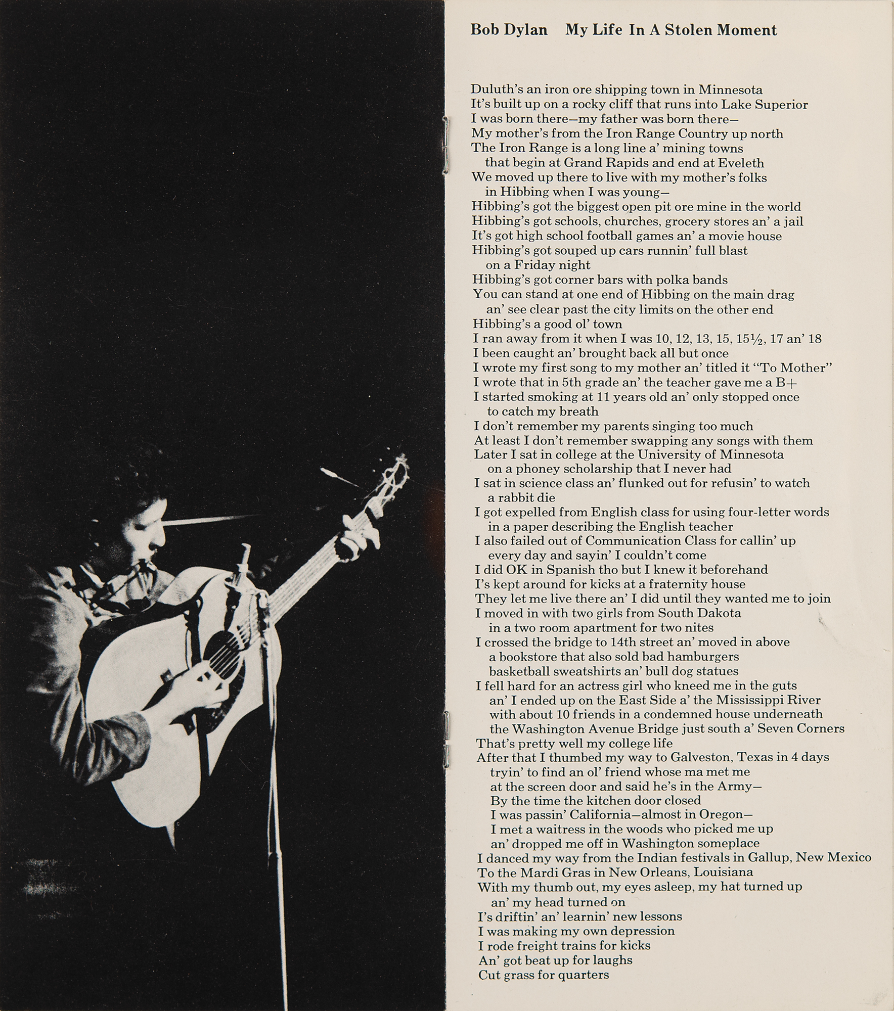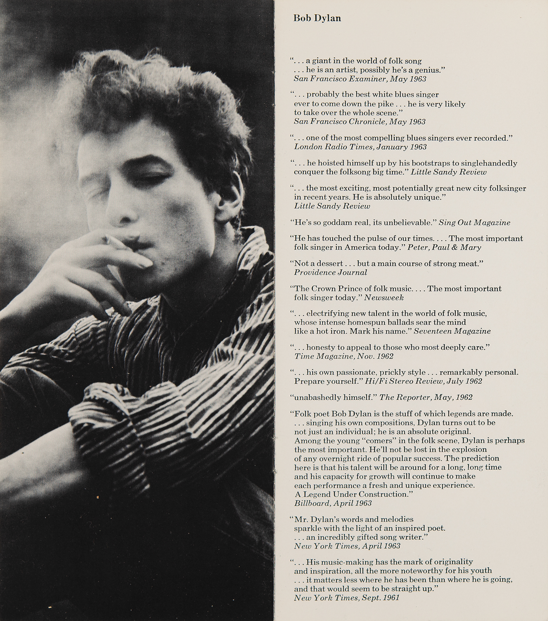 Original 1963 promo booklet for Bob Dylan featuring a close-up portrait on the cover, eight pages, 4 x 9.25, containing one page of critical reviews ("'…a giant in the world of folk song…he is an artist, possibly he's a genius'—San Francisco Examiner, May 1963") followed by his famous autobiographical poem, "My Life in a Stolen Minute," which summarizes his life experiences and perspectives in a concise, impactful, and often apocryphal manner, reflective of his early life and artistic journey as a folk singer. The pamphlet also features several great, early images of Dylan by legendary rock photographer Barry Feinstein. The rear cover notes his agency as International Talent Associates, Inc., and manager as Albert B. Grossman. In fine condition, with a light paperclip impression across the bridge of Dylan's nose.