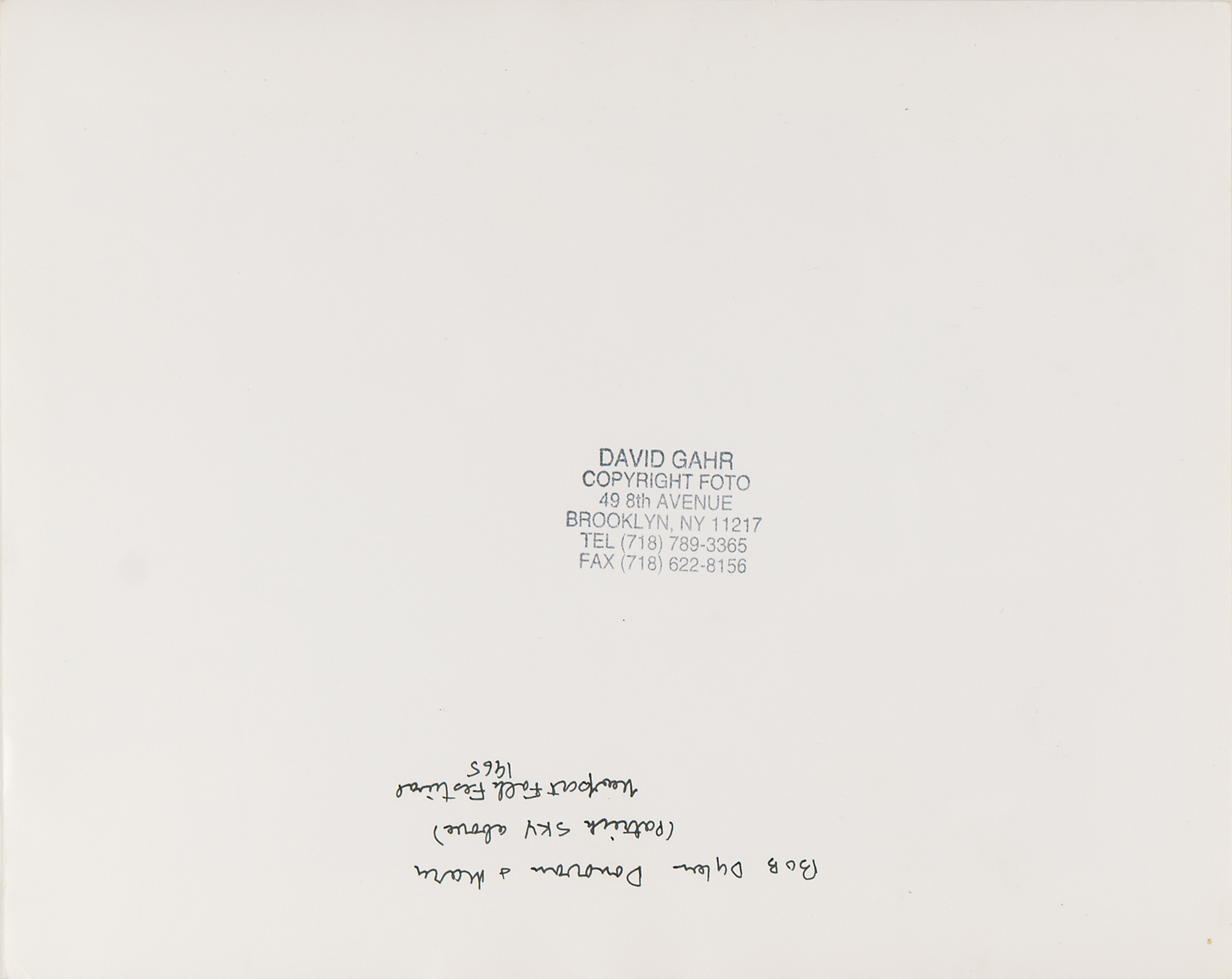 Original semi-glossy 10 x 8 silver gelatin photograph of Bob Dylan, Mary Travers, and Donovan hanging out at the 1965 Newport Folk Festival, taken by photographer David Gahr and printed later from the original negative, signed in the lower border in black felt tip, "David Gahr." The fabulous backstage shot shows the three popular musicians perched on the rear of a van as they smoke and drink in a moment of leisure. Stamped on the reverse with the photographer's copyright, and captioned in his hand: "Bob Dylan Donovan & Mary, (Patrick Sky above), Newport Folk Festival, 1965." In fine condition.