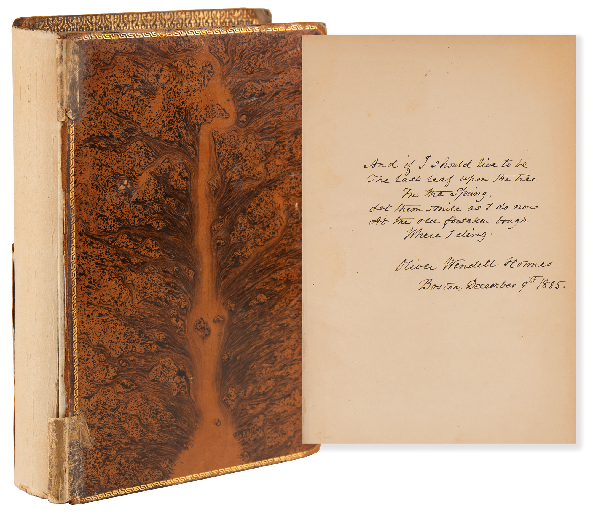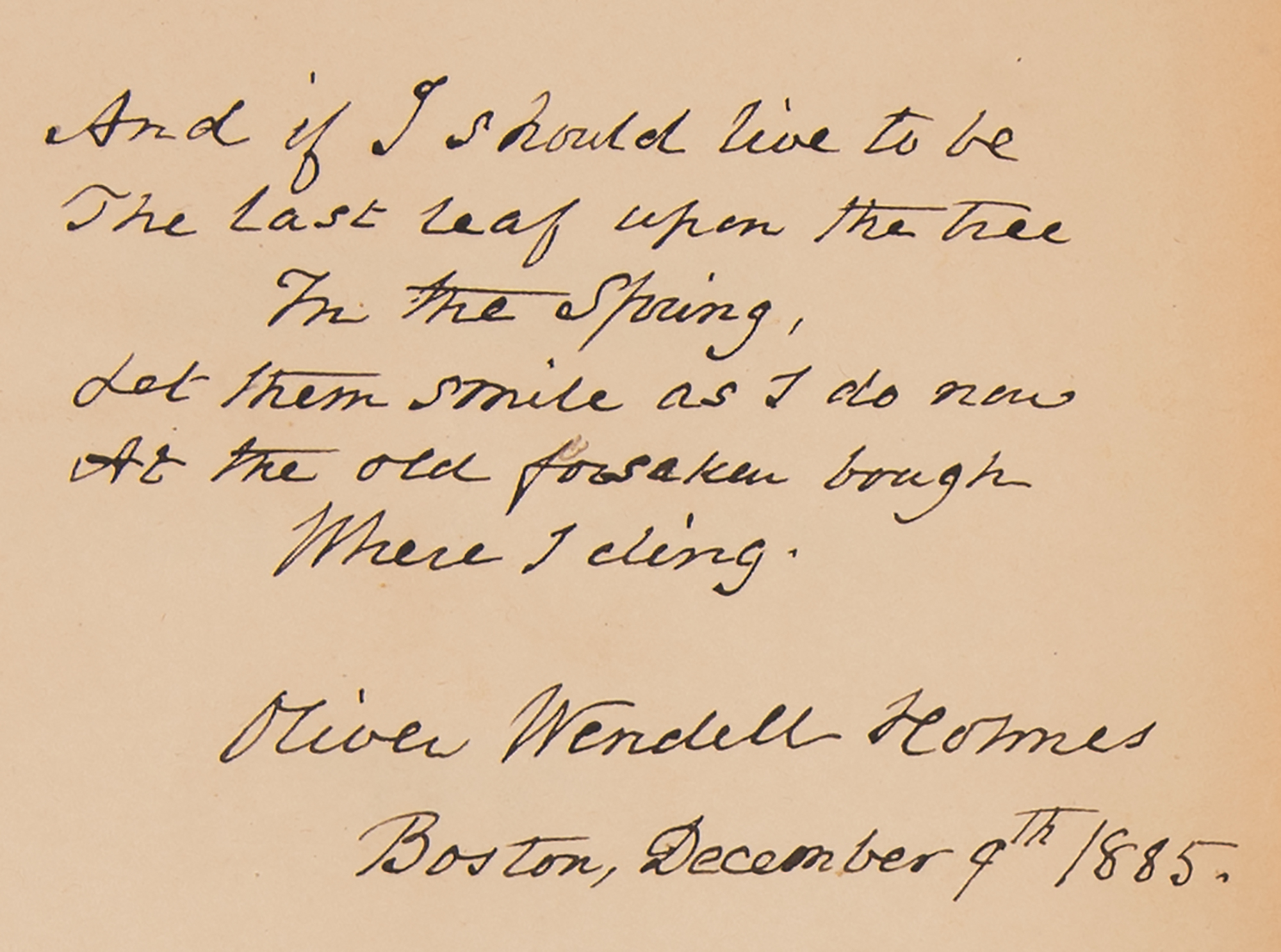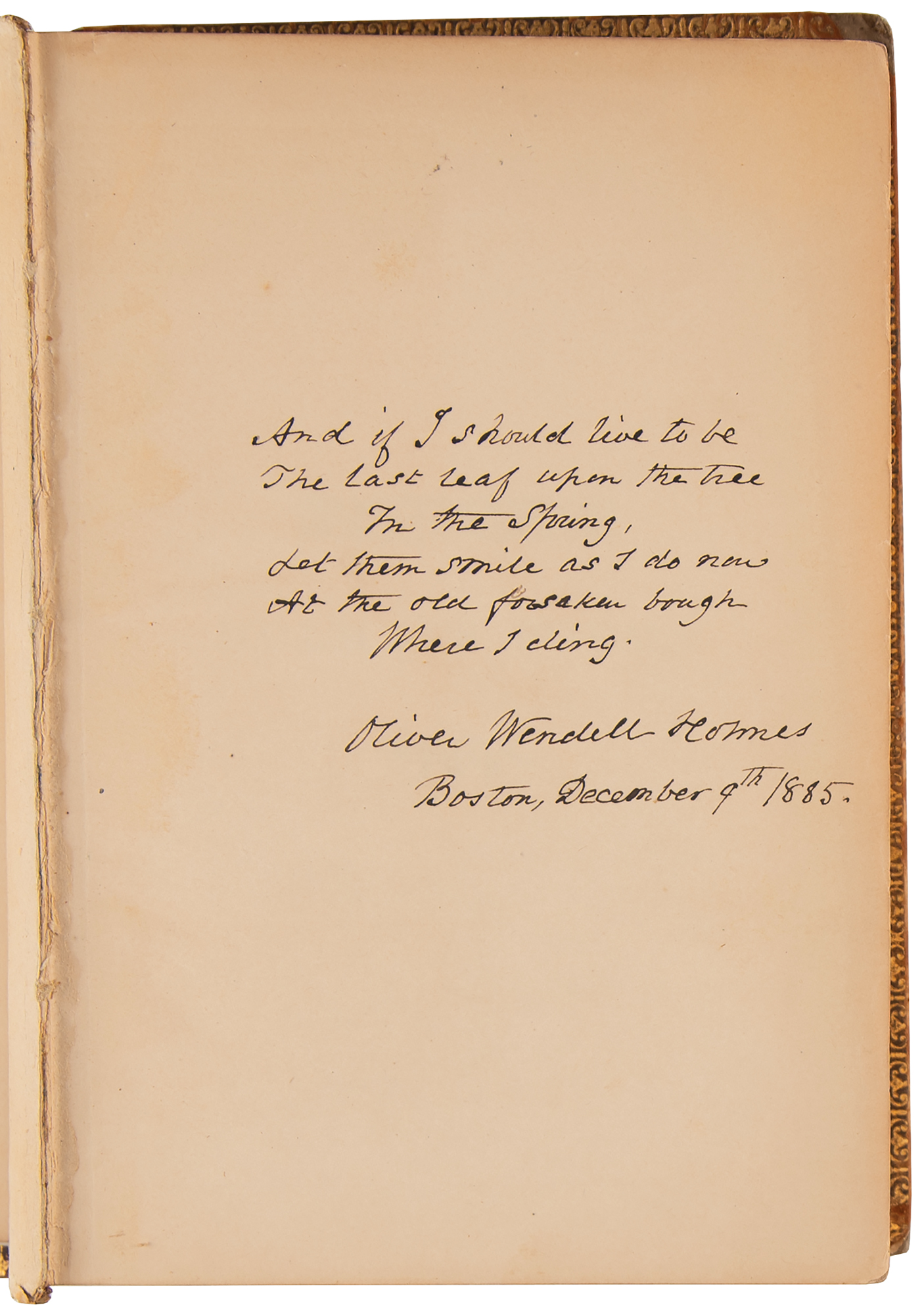 Signed book: Poems of Oliver Wendell Holmes. Boston: Houghton Mifflin, 1882. Hardcover, 5.5 x 8.25, 324 pages. The first free end page features a six-line AQS from Holmes' poem 'The Last Leaf,' which Holmes has signed after the conclusion, adding "Boston, December 9, 1885." The stanza, in full: "And if I should live to be / The last leaf upon the tree / In the spring, / Let them smile, as I do now, / At the old forsaken bough / Where I cling."