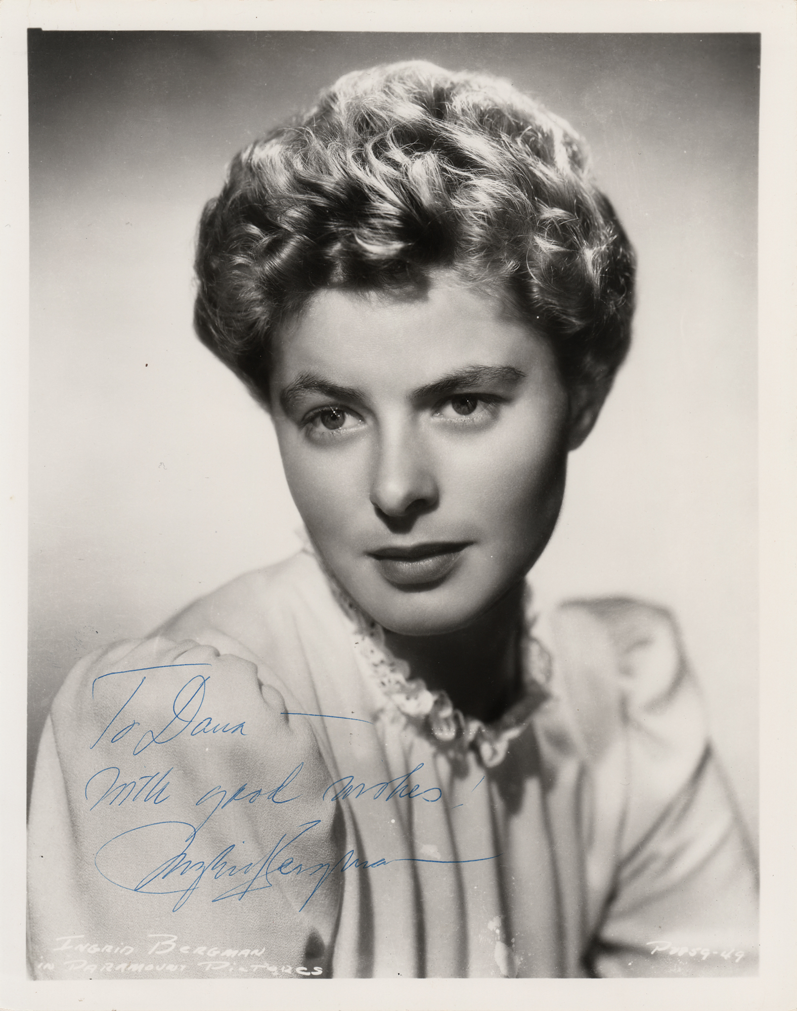 Attractive glossy 8 x 10 Paramount Pictures publicity photo of the Oscar-winning actress, signed and inscribed in blue ballpoint, "To Dana—with good wishes, Ingrid Bergman.” In fine condition.