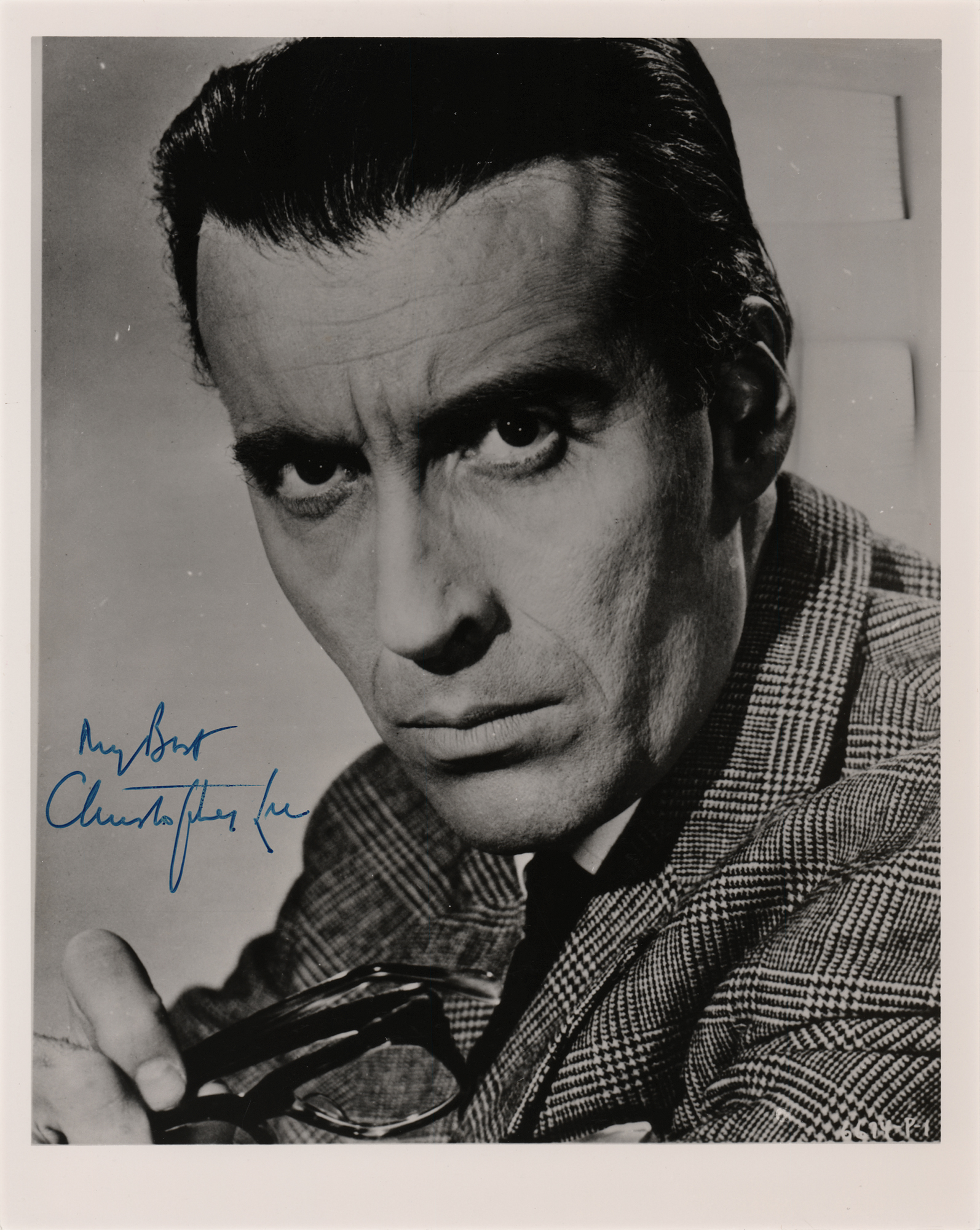 Glossy 8 x 10 close-up photo of the celebrated British actor, signed in blue felt tip, "My Best, Christopher Lee." In fine condition.