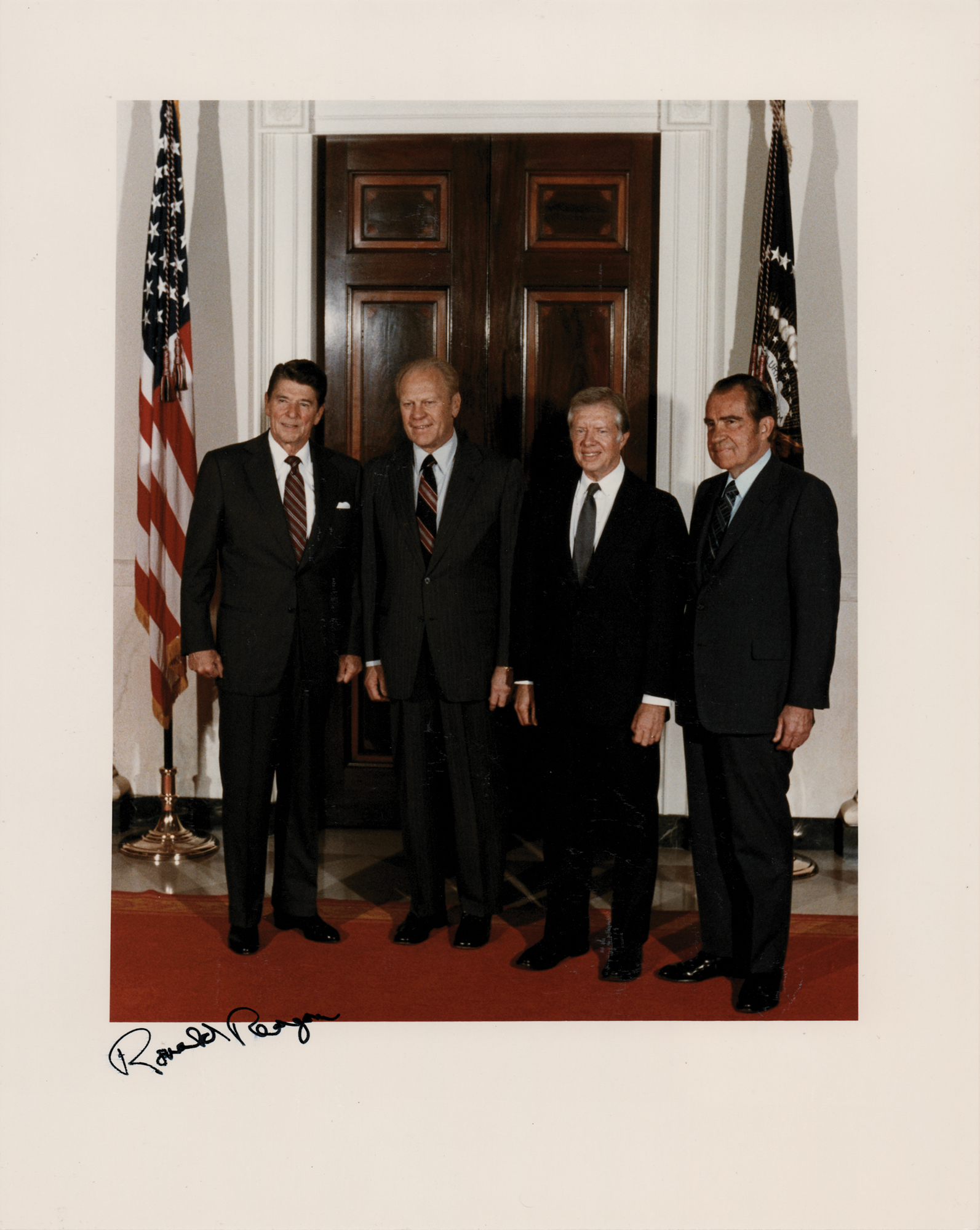 Color satin-finish 8 x 10 photo of Presidents Nixon through Reagan gathered at the White House before departing for Anwar Sadat's funeral in 1981, signed in the lower border in black felt tip, "Ronald Reagan." In fine condition, with a paperclip impression to the top edge.