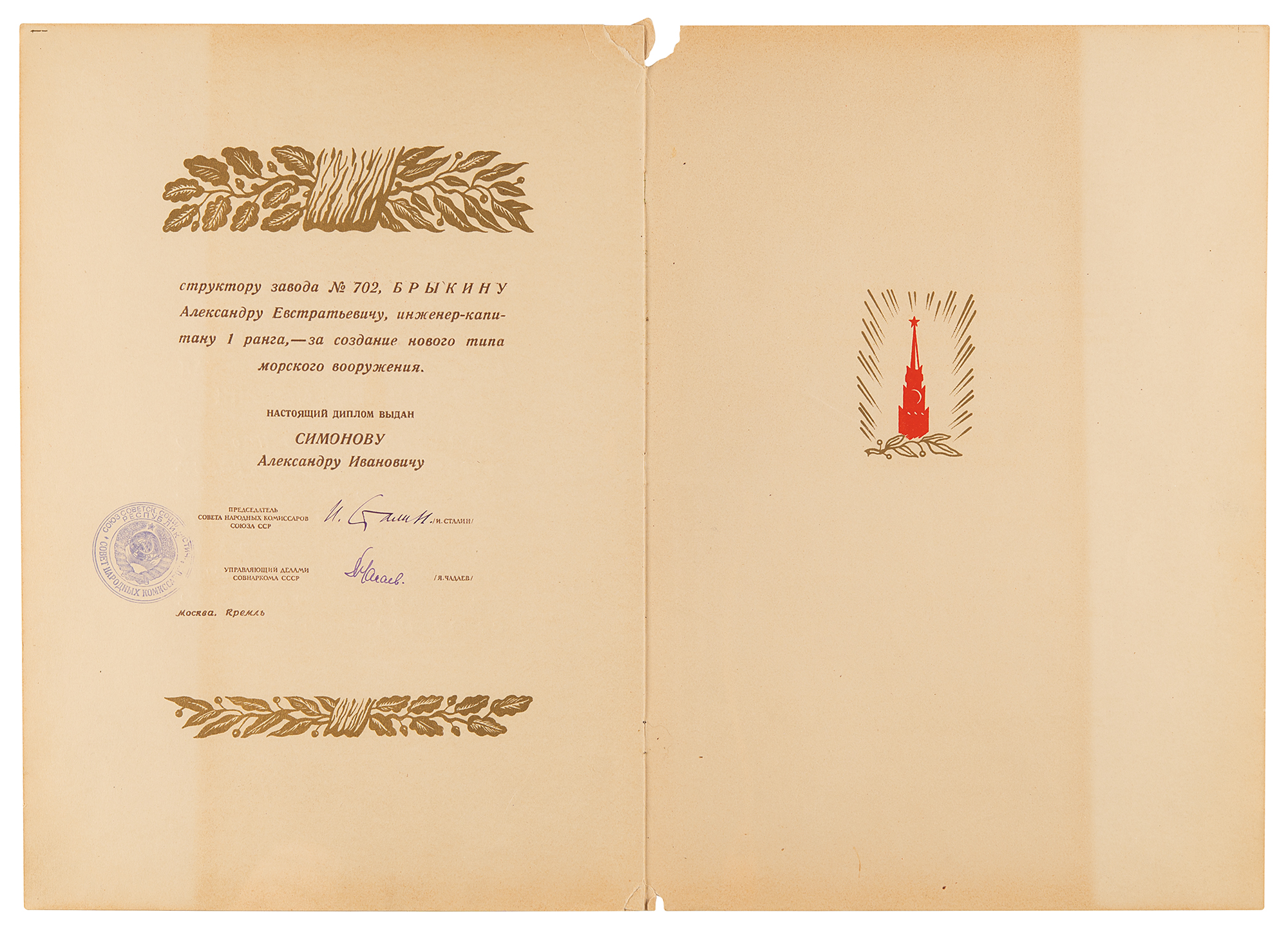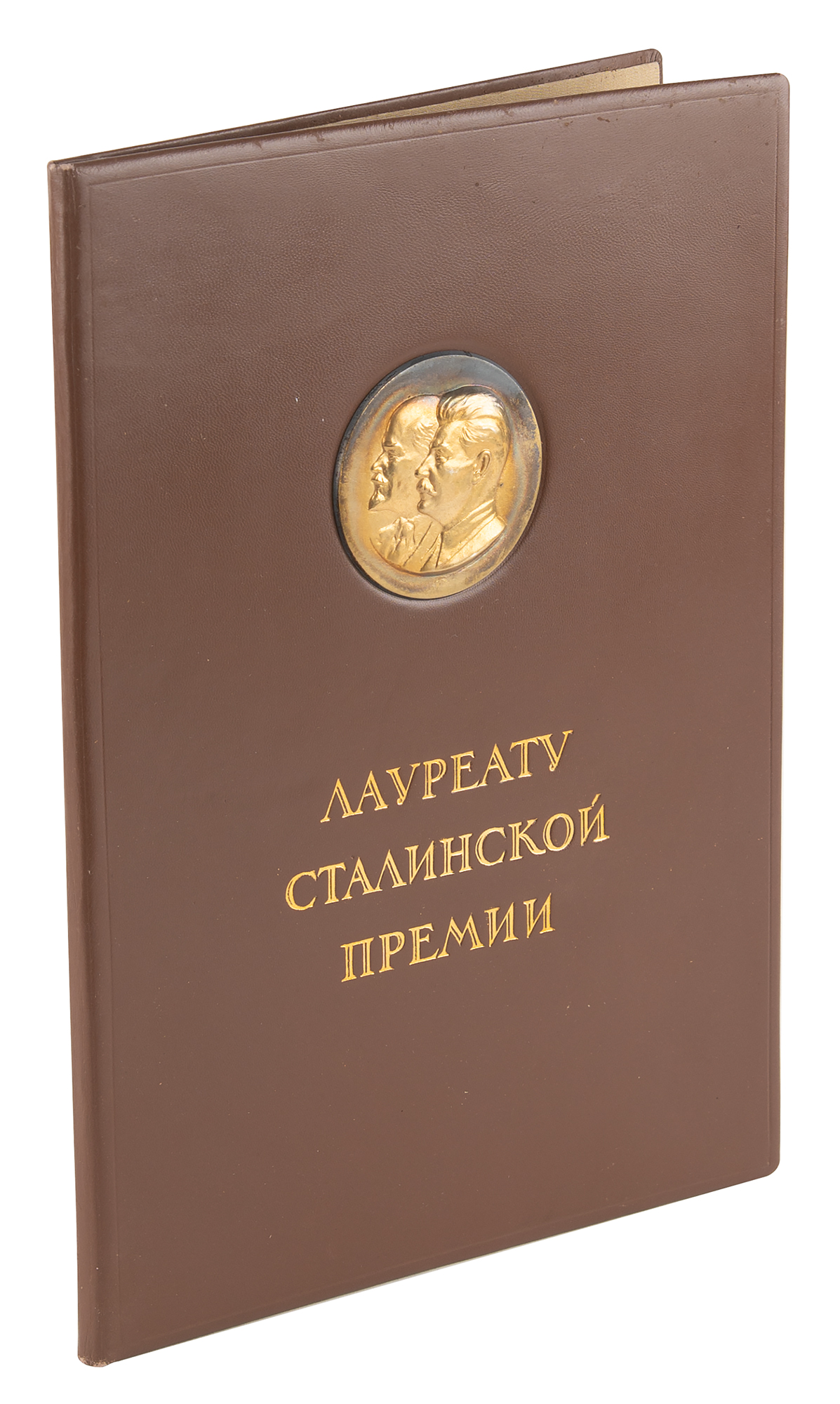 Rare World War II-dated DS in Cyrillic, signed “J. Stalin,” two pages, 9.75 x 14, March 22, 1943. Official ‘Stalin Prize of the First Degree’ award issued to Russian engineer Aleksandr Ivanovich Simonov, who aided in the design of a new naval weapon. The award reads, in part (translated): “By the Decision of the Council of People's Commissars of the USSR, Date March 22, 1943, The Stalin Prize of the First Degree Was Awarded to: Shamarin Nikolai Nikolaevich, Zhygary Grigory Ivanovich, Gorbunov Valentin Dmitrievich, workers of Plant No. 231; Lastochkin Rostislav Ivanovich, engineer of Plant No. 659; Bolkunov Grigory Vasilievich, research associate of Plant No. 389; Simonov Aleksandr Ivanovich, the engineer of plant No. 702; and Brykin Alexander Evstratievich, engineer-captain of the 1st rank; for the creation of a new type of naval weapon.” Signed in ink at the conclusion by Joseph Stalin as Chairman of Soviet of People's Commissars of the Soviet Union, and countersigned by Y. Chadaev of the Council of the People's Commissars. In very good to fine condition, with somewhat irregular light toning, and some paper loss to the top and bottom of the hinge. Accompanied by its rare original maroon box and brown leather presentation folder, the front cover of which bears a gilded round medallion with embossed profiles of Vladimir Lenin and Joseph Stalin. A rare war-dated Soviet document signed by the Russian dictator—the prestigious Stalin Prize existed from 1941 to 1954 and was one of the Soviet Union's highest honors.