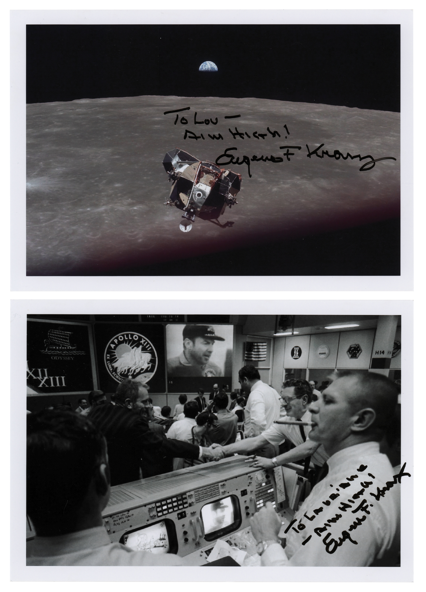 Two glossy 7 x 5 photos: one showing the Apollo 11 LM over the moon's surface, signed and inscribed in black felt tip, "To Lou—Aim High! Eugene F. Kranz"; and one showing Kranz celebrating the safe splashdown of Apollo 13, signed in black felt tip, "To Lauriane—Aim High! Eugene F. Kranz." In overall very fine condition.