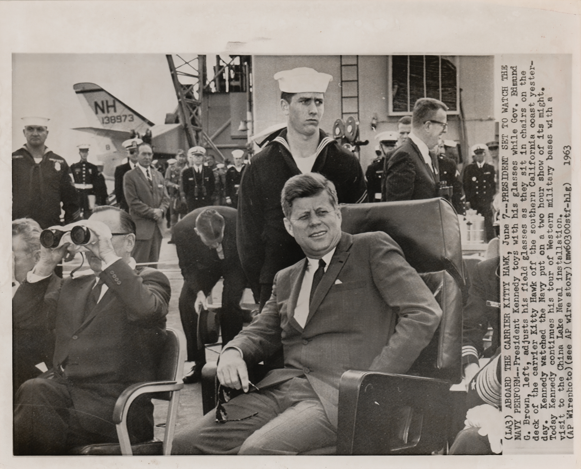 Original vintage glossy 10 x 8 AP wirephoto of President John F. Kennedy onboard the aircraft carrier USS Kitty Hawk during a presidential review of naval capabilities off the coast of southern California in June 1962. Reverse bears an Associated Press credit stamp. In fine condition.