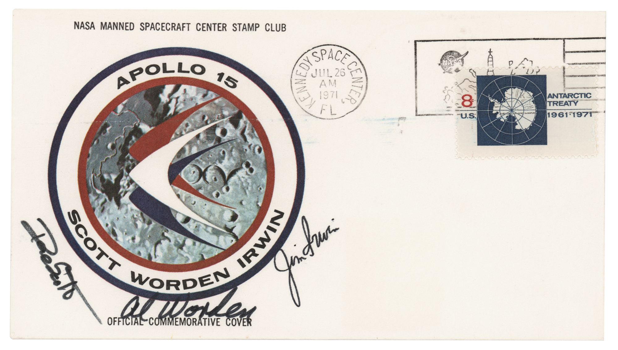 Apollo 15 'Type 1' insurance cover, 6.5 x 3.5, with a cachet of the Apollo 15 mission insignia, and bearing a July 26, 1971, Kennedy Space Center postmark over an Antarctic Treaty 8¢ stamp, signed in black felt tip by Dave Scott, Al Worden, and Jim Irwin. In very fine condition. Accompanied by a letter of authenticity in German from Hermann E. Sieger, attributing the cover to Apollo 15 LMP Jim Irwin's collection.