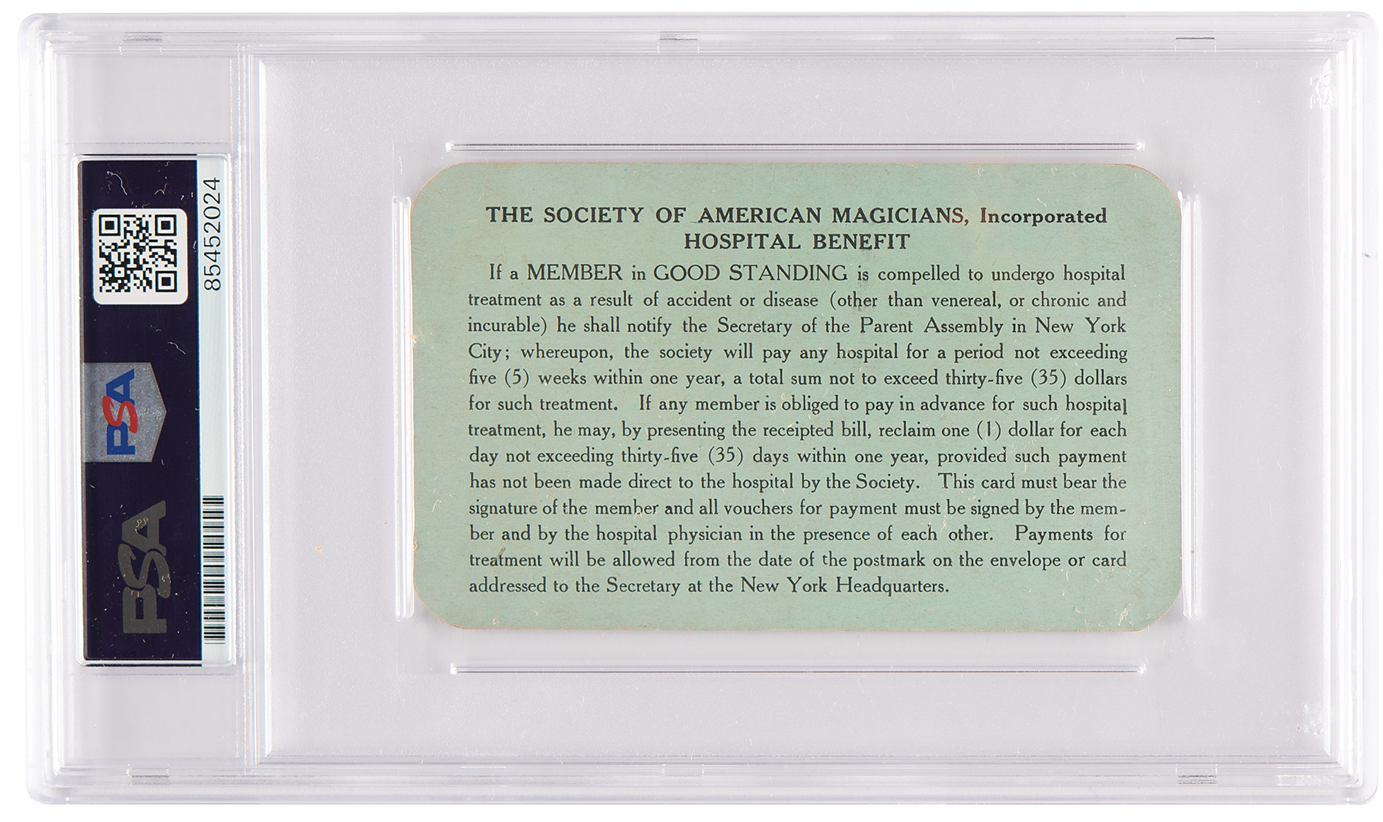 Desirable light green Society of American Magicians membership card issued to Gus Fowler for 1924, 4 x 2.5, boldly signed at the bottom in fountain pen by Harry Houdini as president, and countersigned by Richard Van Dien as secretary. In very fine condition. Encapsulated and graded by PSA/DNA as "GEM MT 10." Founded on May 10, 1902, in the back room of Martinka's magic shop in New York, the Society of American Magicians expanded under the leadership of Harry Houdini during his term as National President from 1917-1926.