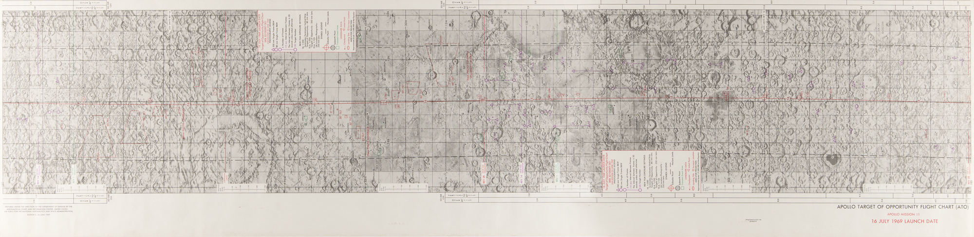 - Color second edition of the Apollo 11 Target of Opportunity Flight Chart, 58.25 x 14, issued as SKB 32100097-301, dated June 26, 1969. Lithographed by ACIC 7-69, and prepared under the direction of the Department of Defense by the Aeronautical Chart and Information Center.