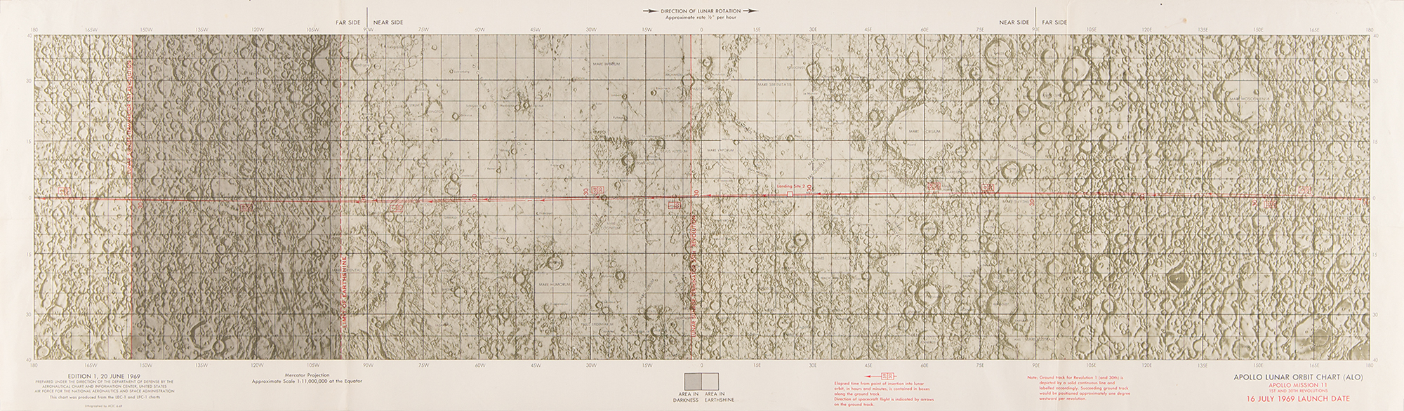 - Color first edition of the Apollo 11 Lunar Orbit Chart, 41 x 12, dated June 20, 1969. Lithographed by ACIC 6-69, and prepared under the direction of the Department of Defense by the Aeronautical Chart and Information Center.