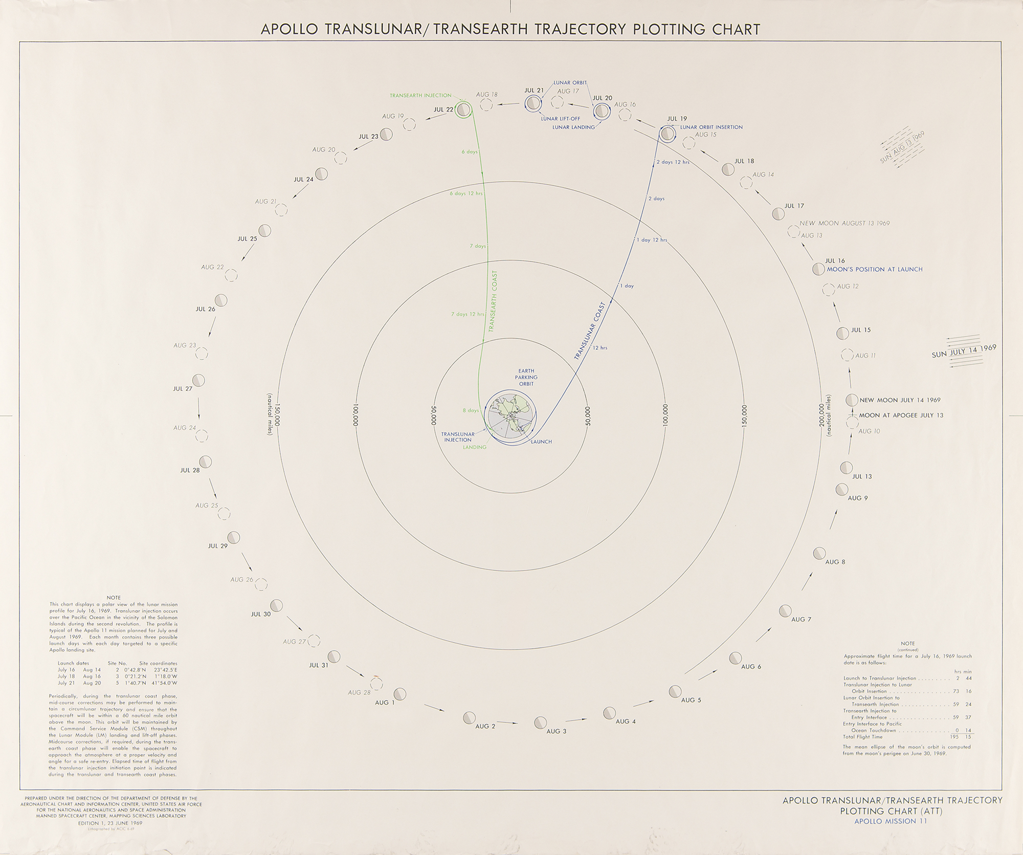 - Color first edition of the Apollo 11 Translunar/Transearth Trajectory Plotting Chart (ATT), 23.75 x 20, dated June 23, 1969. Prepared under the direction of the Department of Defense by the Aeronautical Chart and Information Center.