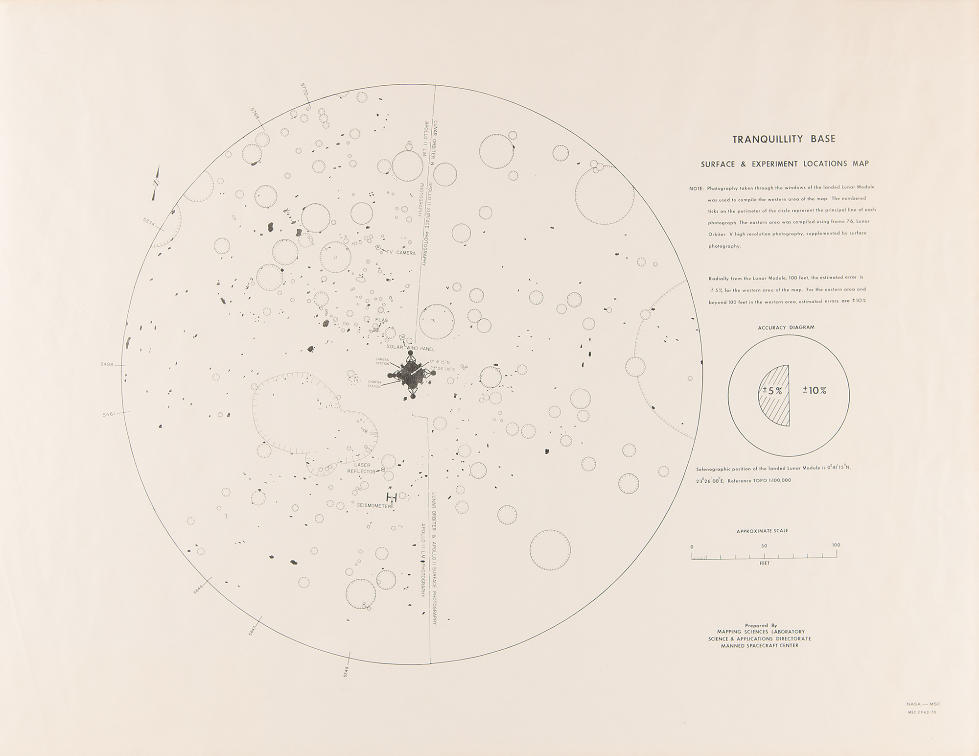 - Uncommon ‘Surface & Experiment Location Map’ for ‘Tranquility Base,’ the landing site of the Apollo 11 mission, 22 x 17, showing the placement of the Lunar Module Eagle, American flag, TV camera, solar wind panel, seismometer, and laser reflector. Prepared by the Mapping Sciences Laboratory, Science & Applications Directorate of the Manned Spacecraft Center.