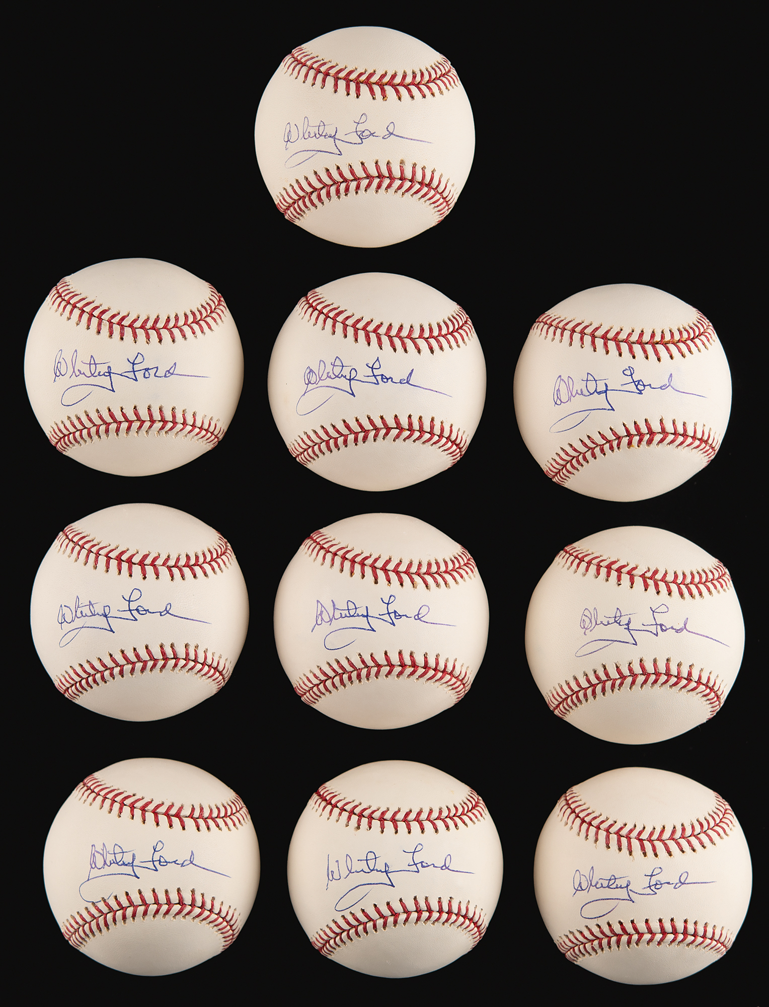Collection of ten choice official Rawlings Major League (Selig) baseballs, each signed on the sweet spot in blue ballpoint by Whitey Ford. In overall very fine condition. Accompanied by their Rawlings boxes.
