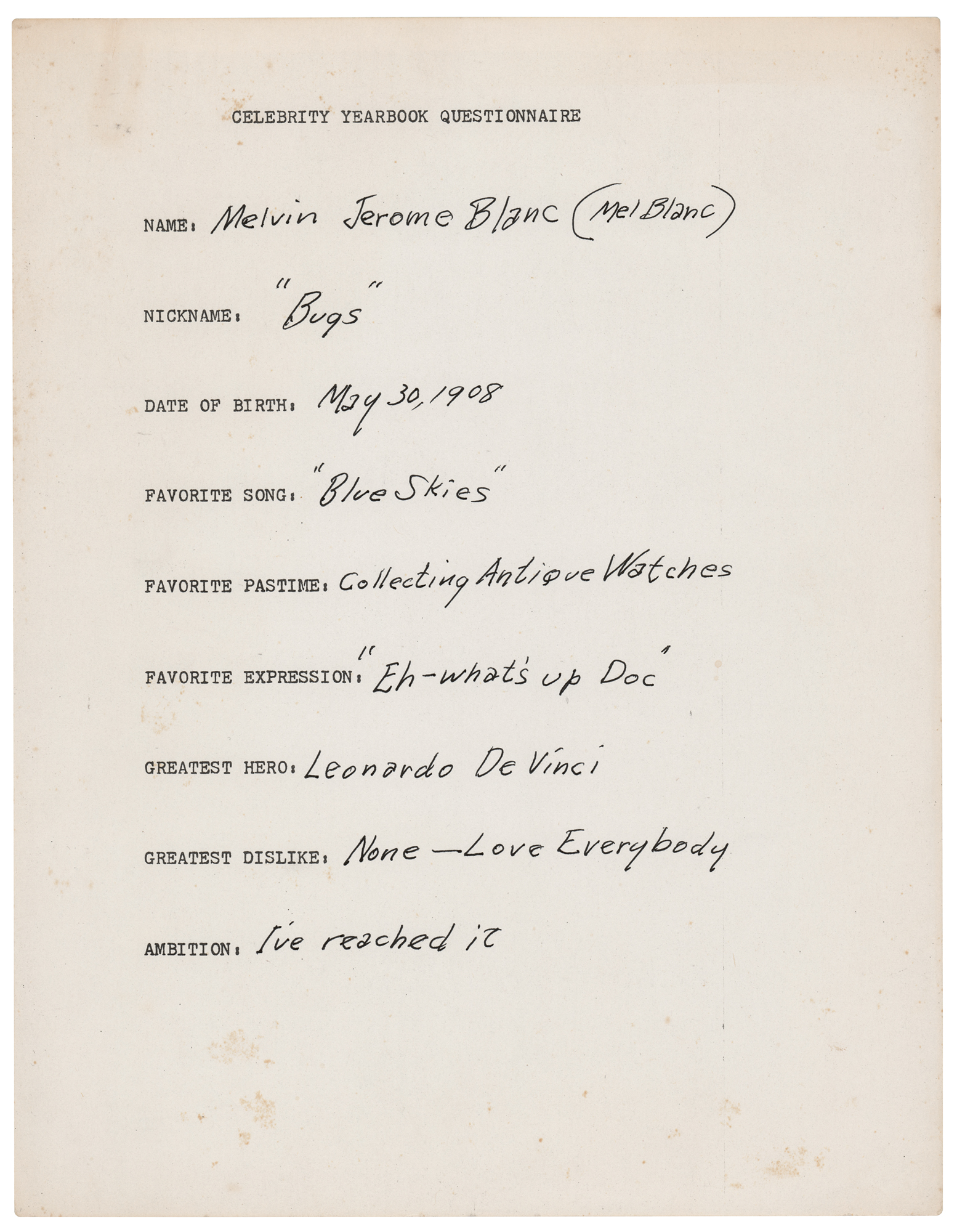 Questionnaire filled out and signed by Mel Blanc, "Melvin Jerome Blanc (Mel Blanc)," one page, 8.5 x 11, no date but circa late 1970s, responding to inquiries related to an unpublished 'Celebrity Yearbook.' The legendary voice actor fills out his nickname ("Bugs"), date of birth ("May 30, 1908"), favorite song ("Blue Skies"), favorite pastime ("Collecting Antique Watches"), favorite expression ("Eh—what's up Doc"), greatest hero ("Leonardo De Vinci"), greatest dislike ("None—Love Everybody"), and ambition ("I've reached it"). In fine condition.