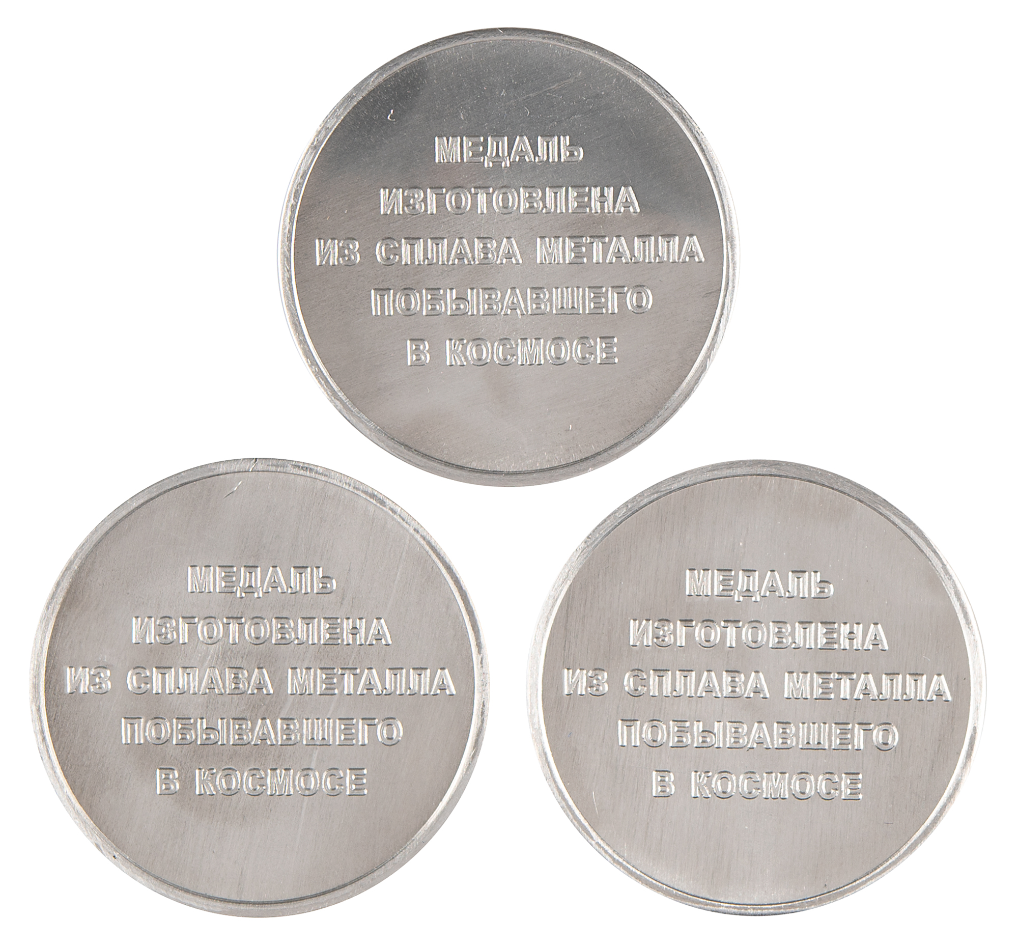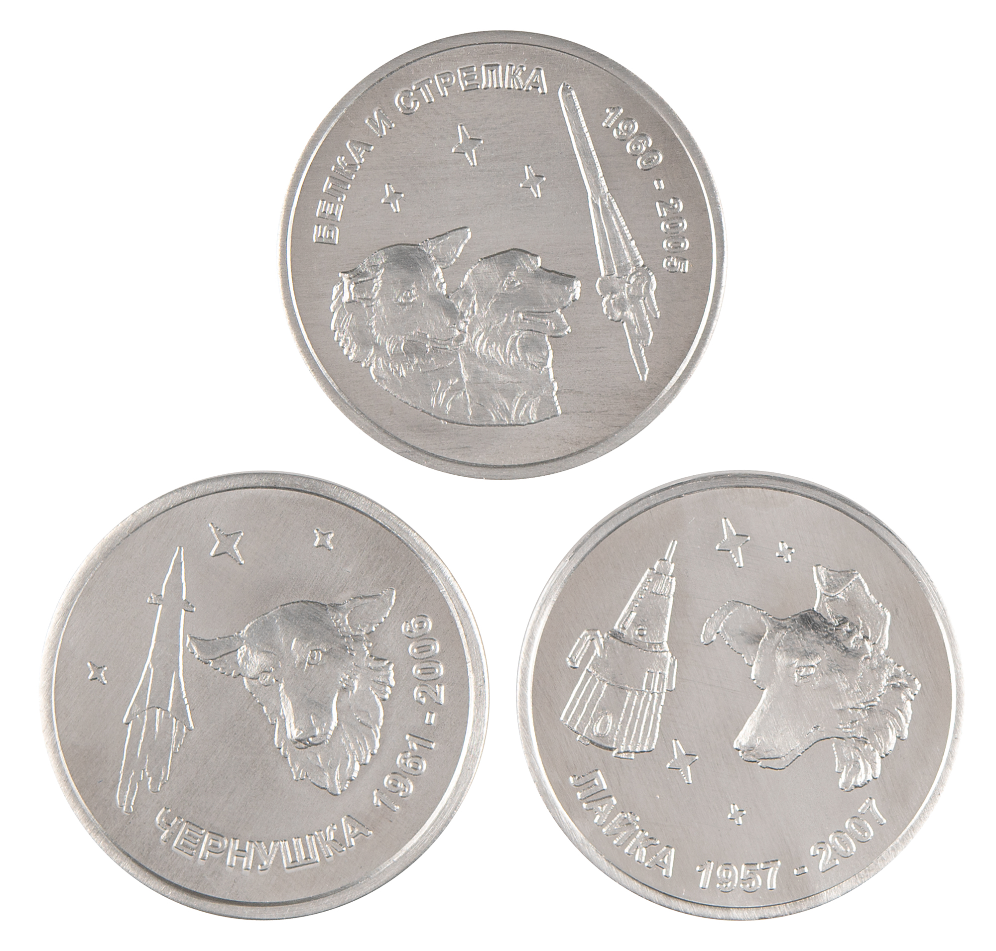 Three aluminum commemorative coins, all approximately 1.25″ in diameter, issued between 2005 and 2007, each honoring a different unmanned Sputnik mission and its canine passenger. The coins honor Sputnik 2 (Laika), Sputnik 5 (Belka and Strelka), and Sputnik 9 (Chernushka). All three were issued by the Samara Industrial Complex, makers of the Soyuz spacecraft, and are made from metal that was flown in space. In overall fine condition.