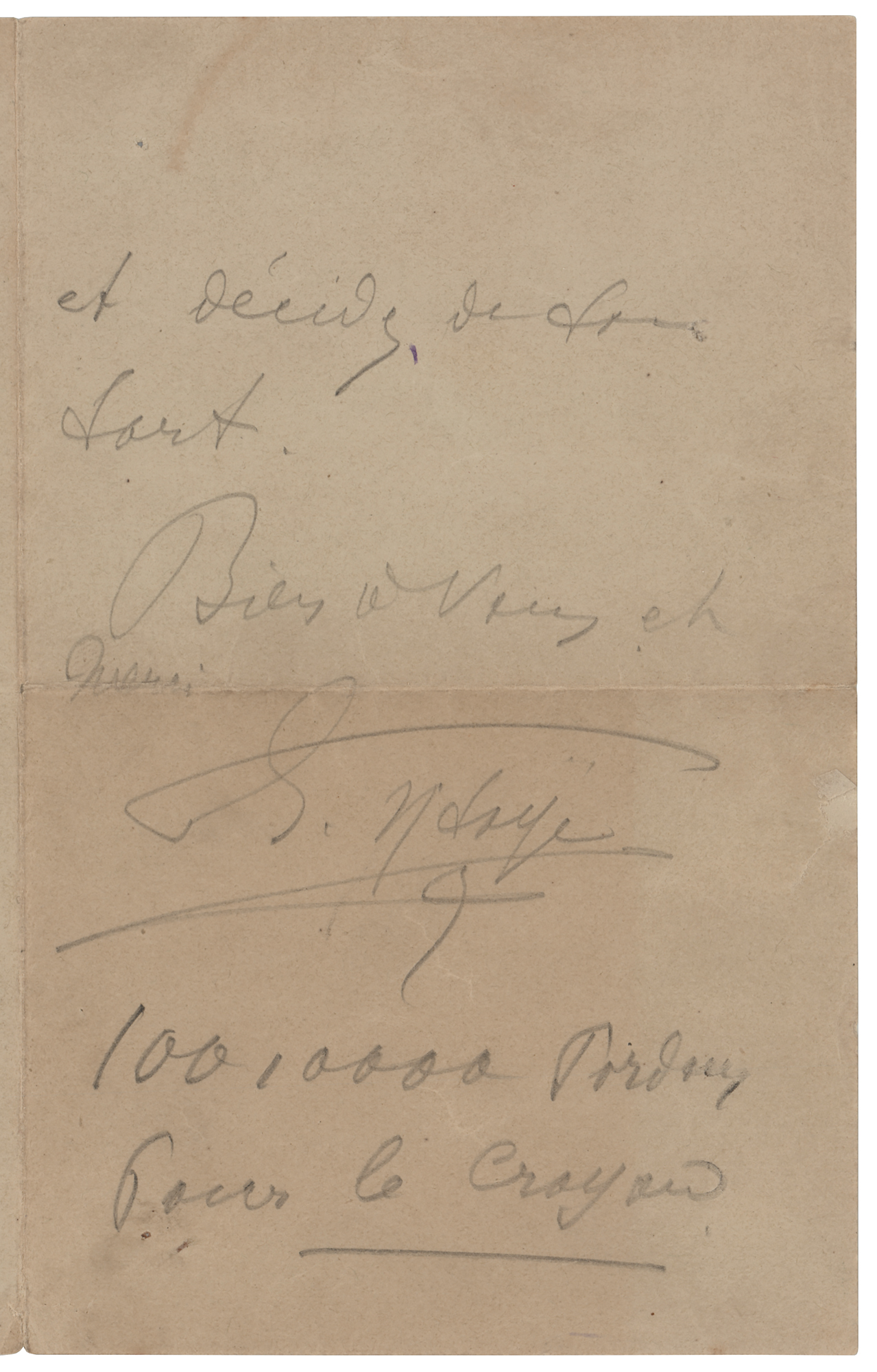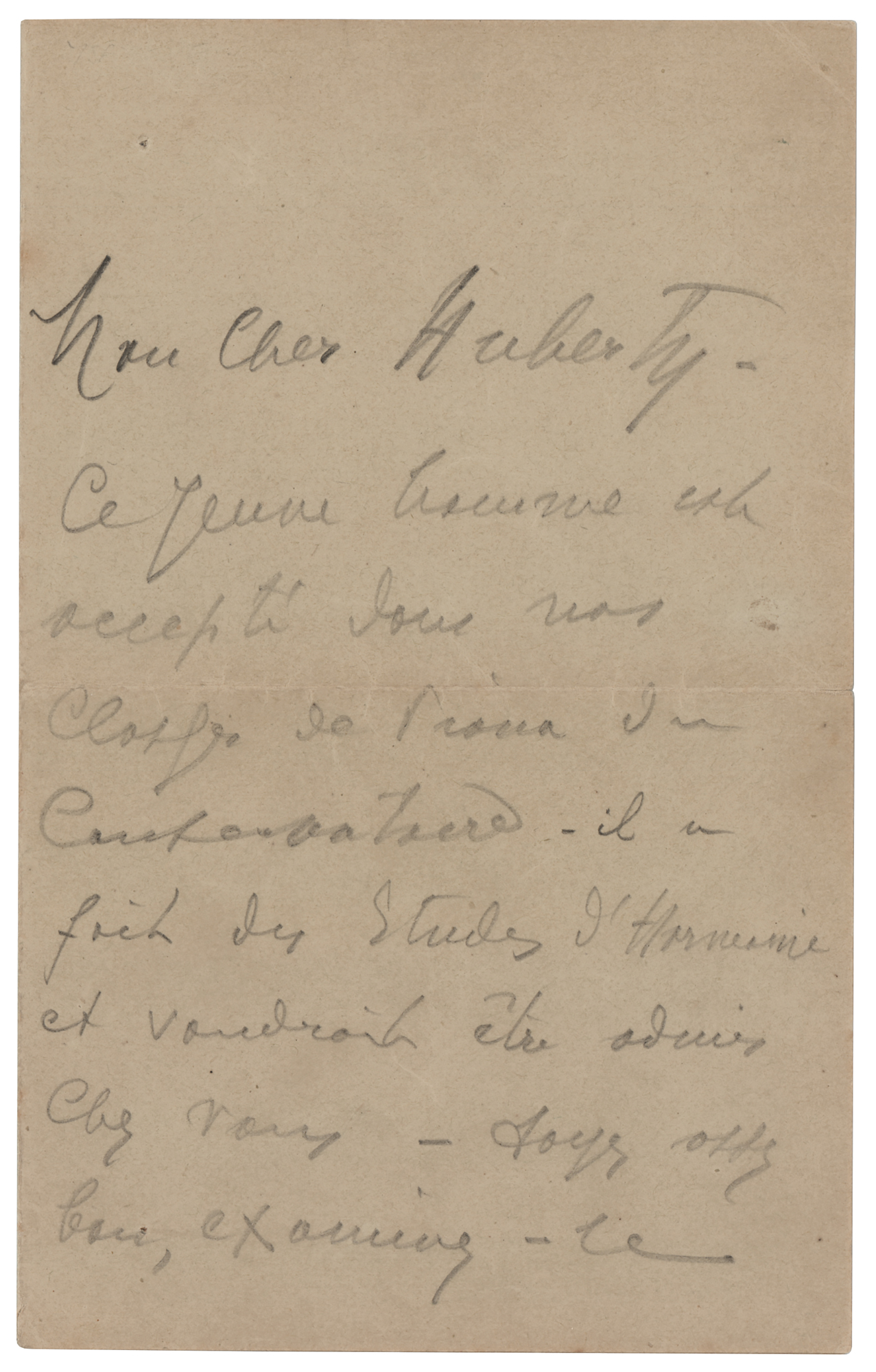 Belgian violin virtuoso, composer, and conductor (1858-1931) known as 'The King of the Violin.' ALS in pencil, in French, signed “E. Ysaye,” two pages on two adjoining sheets, 4.25 x 6.75, no date. Handwritten letter to "Huberty," in part (translated): "This young man was accepted in our piano classes at the Conservatory. He has finished his harmony studies and would like to be admitted to your classes. To see if he is good enough, examine him, and decide his fate." In fine condition, with a short tear to the right edge of the last page.