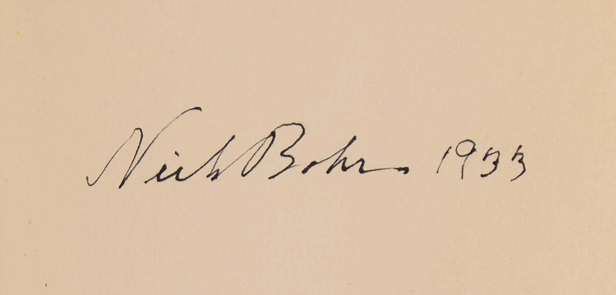 Signed book: Wagner's Parsifal, as retold by Oliver Huckel. Later printing. NY: Thomas Y. Crowell Co., 1903. Hardcover, 5.25 x 7.5, 71 pages. Signed on the first free end page in fountain pen, "Niels Bohr, 1933." Penciled in another hand above: "Niels Bohr's Autographed Copy." In very good to fine condition, with substantial scuffing and some staining to the covers.