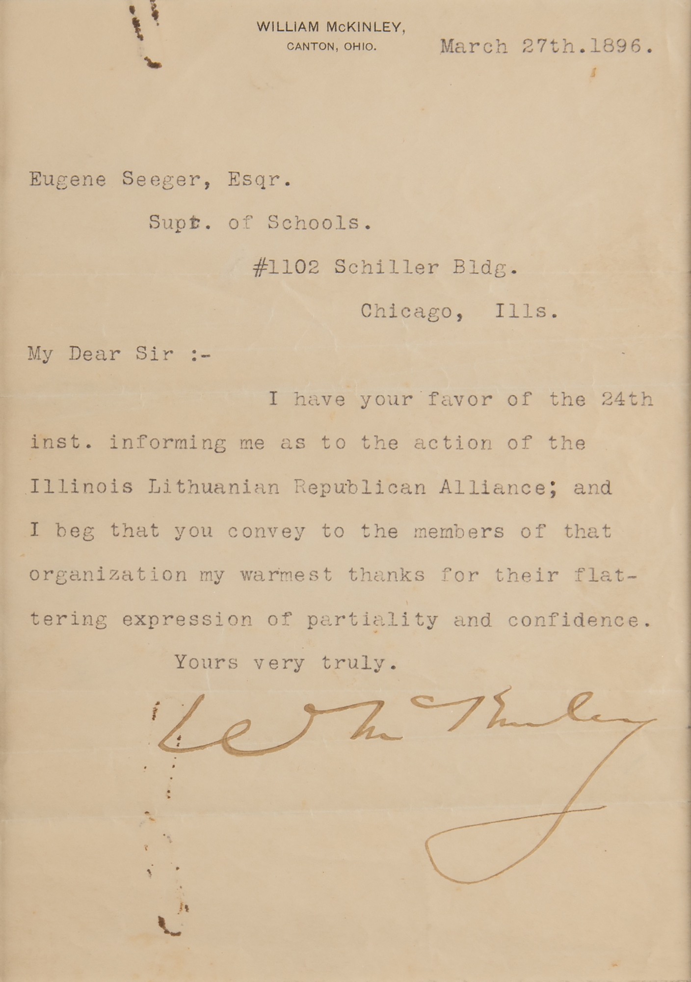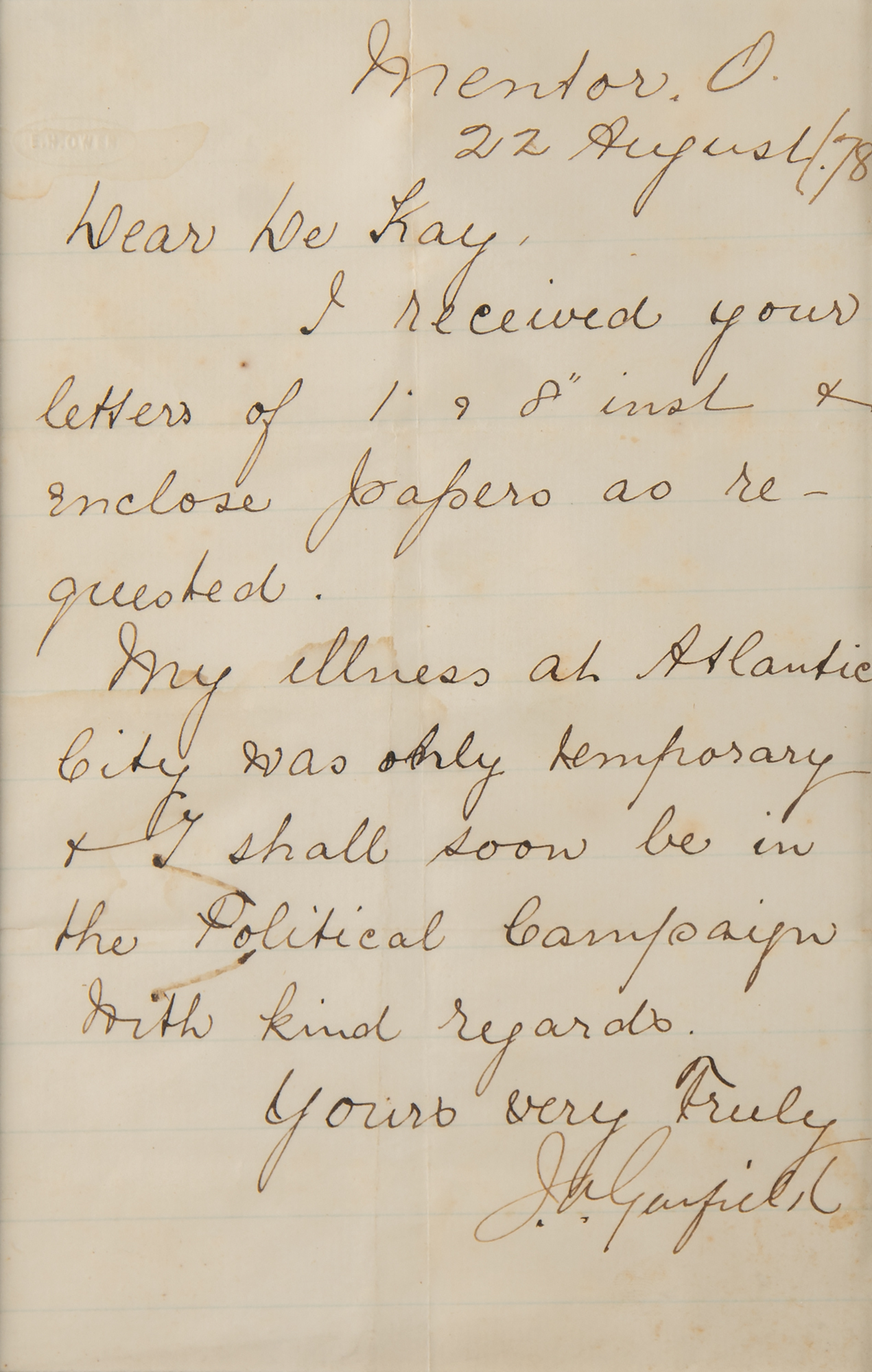 Two letters: LS signed "J. A. Garfield," one page, 4.75 x 7.5, August 22, 1878, in part: "My illness at Atlantic City was only temporary & I shall soon be in the political campaign"; and a TLS signed "W. McKinley," one page, 5.25 x 7.5, personal letterhead, March 27, 1896, in part: "I have your favor of the 24th inst. informing me as to the action of the Illinois Lithuanian Republican Alliance; and I beg that you convey to the members of that organization my warmest thanks for their flattering expression of partiality and confidence." Matted and framed together with two FDCs to an overall size of 24 x 13. In very good to fine condition, with light dampstaining to the Garfield, and rusty paperclip impressions to the McKinley.