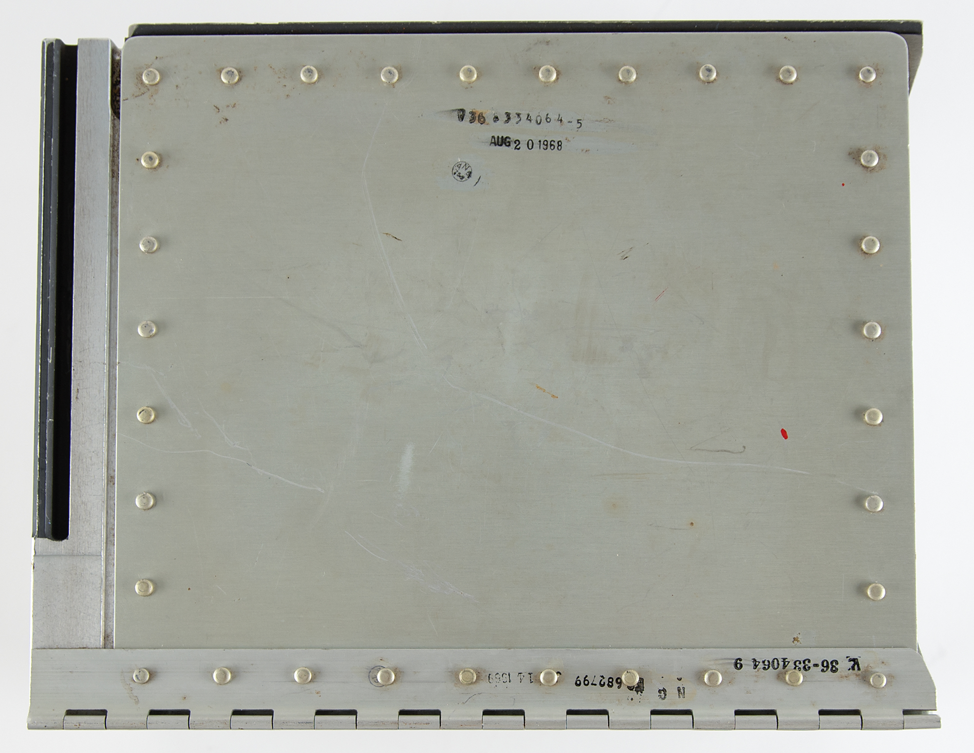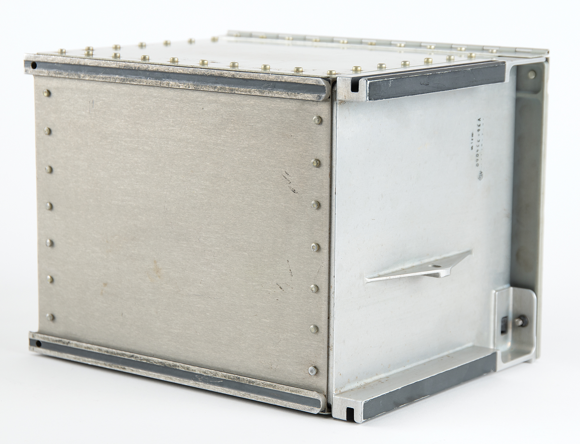 Apollo Command Module storage locker for photography equipment, 11˝ x 8.5˝ x 8.5˝, composed of an aluminum and stainless steel body, with brass-tone twin levers to the front cover that drops to reveal the interior, which bears stamped part numbers: “V36-334064, ASSEM. Jul. 24, 1969, 06361A 015830,” “V36-334063, NC 640072, MFG 4 29 69.” The exterior also bears part numbers dated to 1967 and 1968, and the left and back sides feature upper and lower sliding tracks. In fine condition, with various scuffs and marks. This storage locker, which was typically found in the lower-hand equipment bay of the Apollo Command Module and marked as “B3,” was designed to safely house camera and photography accessories. The ‘Command Module Crew Station Stowage List’ found in the NASA Technical Note ‘Apollo Experience Report - Crew Station Integration,’ lists the locker’s equipment as ‘18-mm lens,’ ‘16-mm power cable with strap,’ ‘right-angle mirror,’ and ‘5-mm lens with cover.’