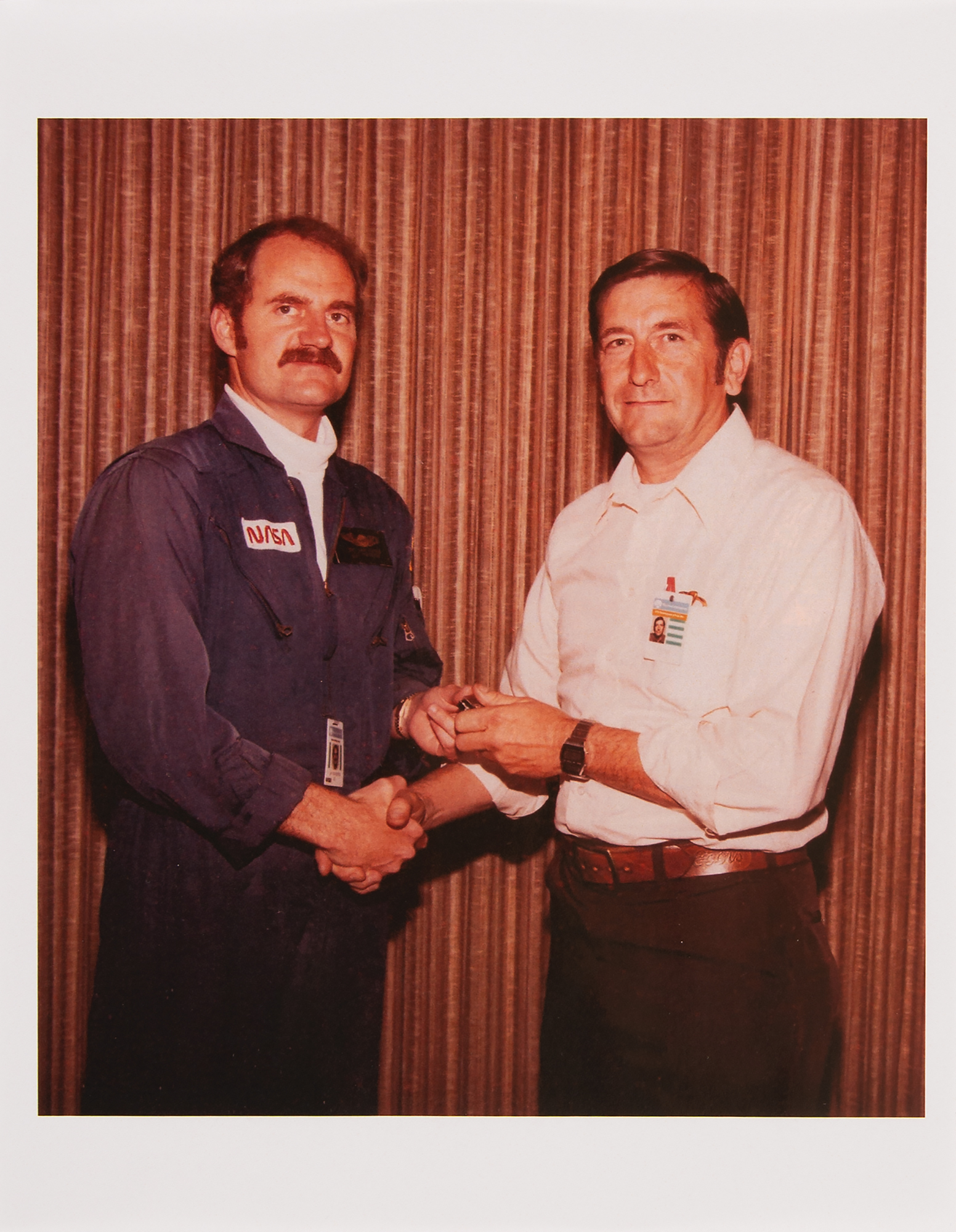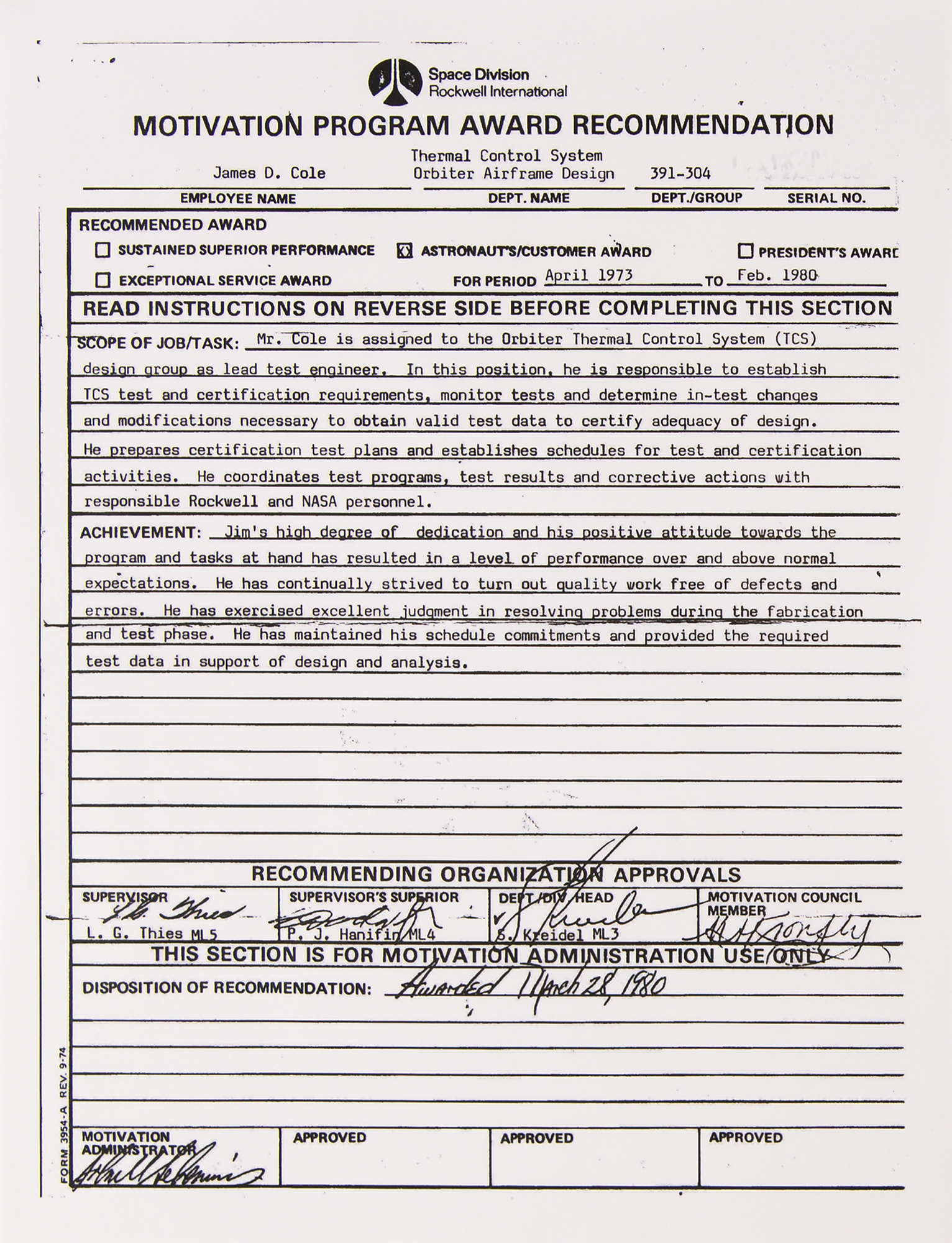 The Astronaut’s Office presented this pin to veteran NASA engineer James D. Cole for his work on the Space Shuttle Orbiter’s Thermal Control System. Accompaniments include a copy of the ‘Motivation Program Award Recommendation’ sheet from Rockwell’s Space Division, printed images of Cole accepting the pin from Shuttle astronaut James van Hoften and famed chief engineer Charlie Feltz (with facsimile signature), and a copy of a congratulatory letter from Van Hoften from March 28, 1980, which reads: