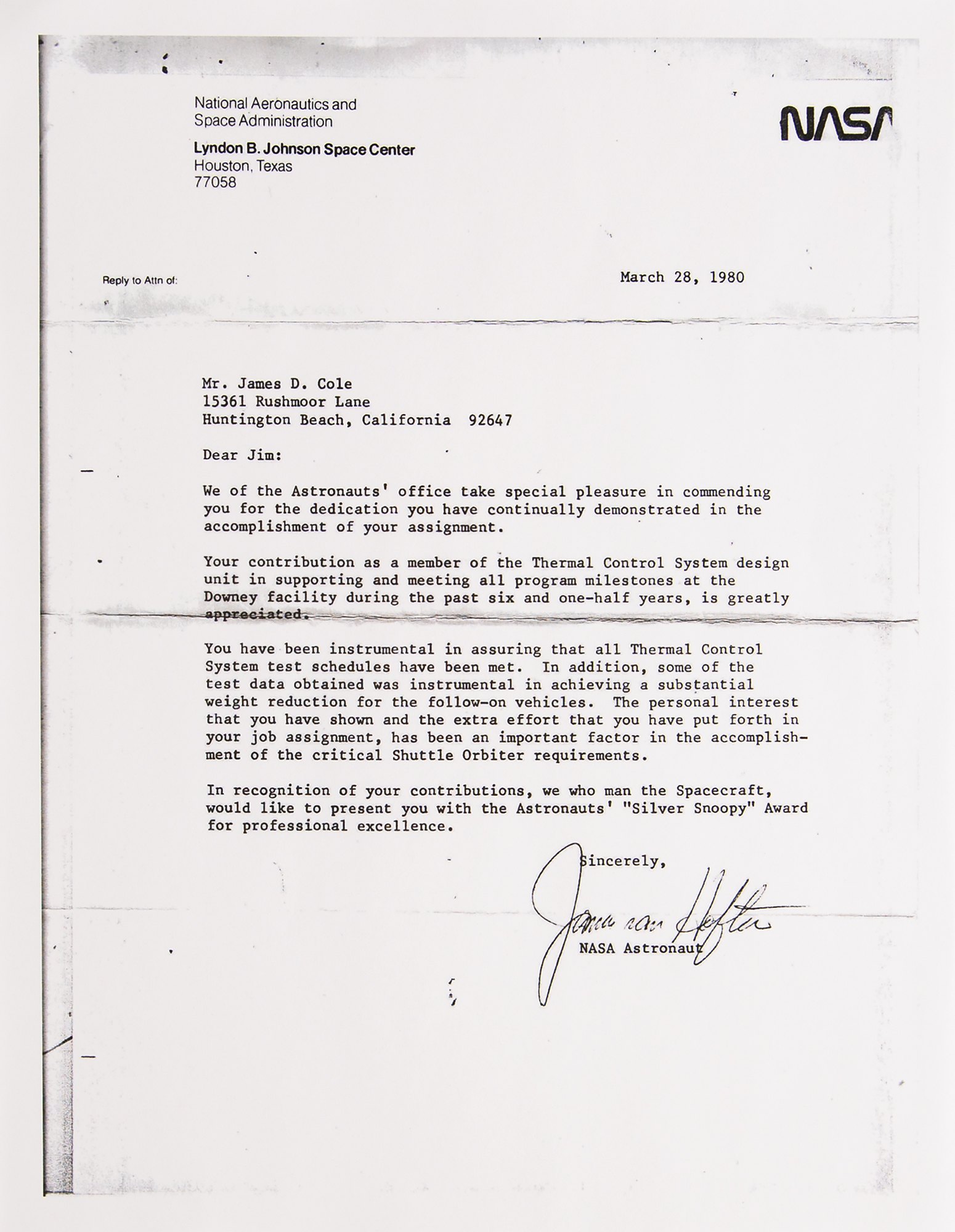 You have been instrumental in assuring that all Thermal Control System test schedules have been met. In addition, some of the test data obtained was instrumental in achieving a substantial weight reduction for the follow-on vehicles. The personal interest that you have shown and the extra effort that you have put forth in your job assignment, has been an important factor in the accomplishment of the critical Shuttle Orbiter requirements. In recognition of your contributions, we who man the Spacecraft, would like to present you with the Astronauts' ‘Silver Snoopy’ Award for professional excellence.”