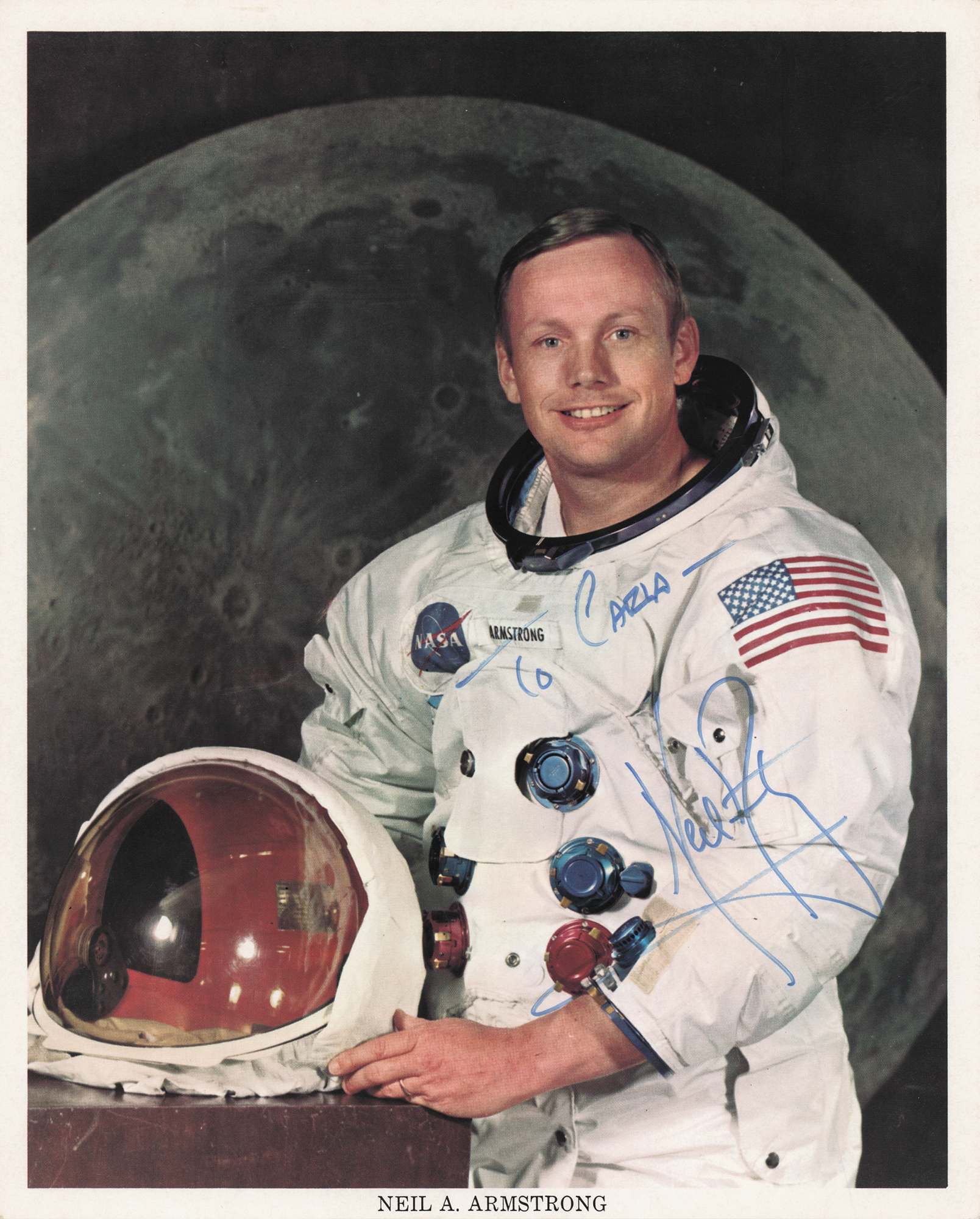 Official color 8 x 10 NASA lithograph of Neil Armstrong in his white space suit against a lunar backdrop, signed and inscribed in blue felt tip, "To Carla – Neil Armstrong." In very fine condition.