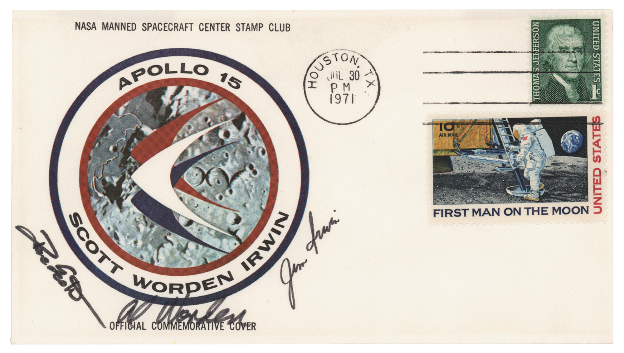 Desirable Apollo 15 commemorative cover with a cachet of the mission insignia and text to top and bottom, "NASA Manned Spacecraft Center Stamp Club, Official Commemorative Cover," postmarked July 30, 1971, the lunar landing date of the Apollo 15 mission, signed in black felt tip by the entire crew: Dave Scott, Al Worden, and Jim Irwin. In very fine condition.
