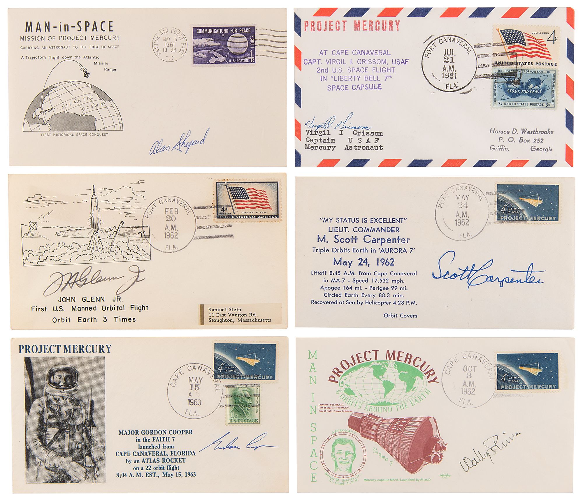 Sought-after, rare complete set of six Project Mercury launch day covers, each signed in ink by the associated astronaut. Includes: