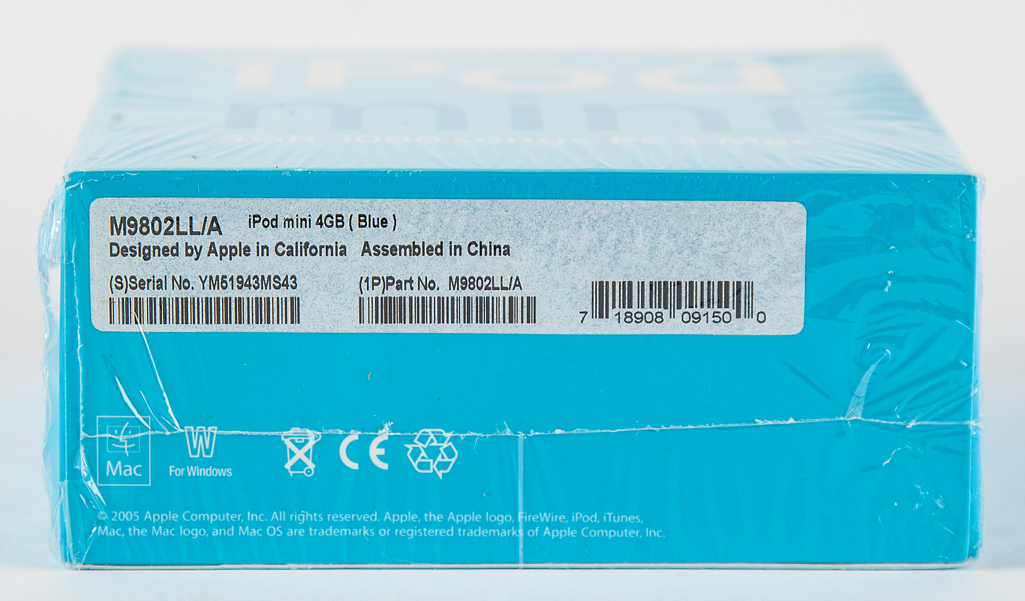 Unopened second-generation original blue Apple iPod Mini, Part No. M9802LL/A (4GB), Serial No. YM51943MS43. The box features life-size front and side images of the iPod Mini, a list of the music player's specifications, and text reading: “iPod mini, 4GB 1000 songs PC+Mac.” In brand new condition, with dings to corners, and tears to the original shrink wrap.