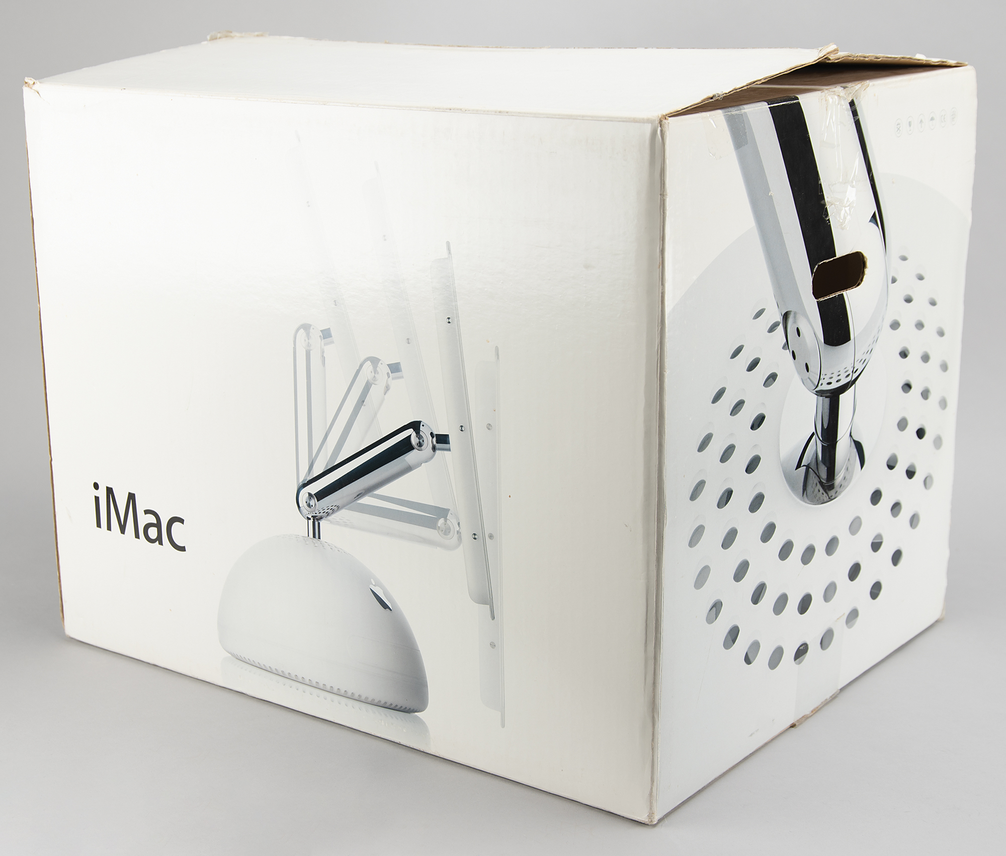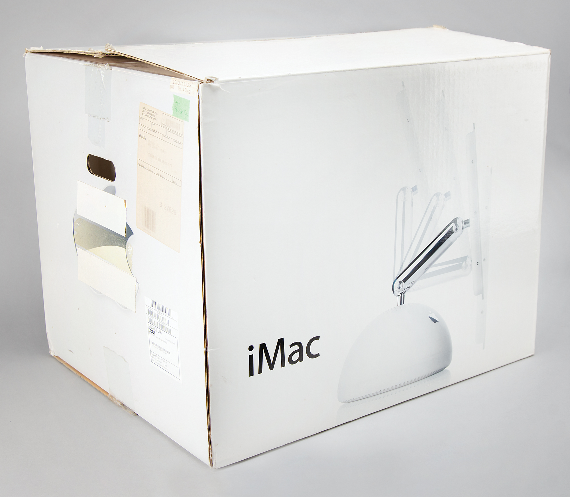 Apple iMac G4 all-in-one computer, Model No. M6498, Part No. M9285LL/A, Serial No. W83481B0PVK, featuring a 15˝ flatscreen liquid-crystal display mounted on a stainless steel swivel arm, 700MHz PowerPC 7441 processor, 128MB RAM, and 40GB hard drive. Complete in its original box and accompanied by accessories including an Apple Pro Mouse, cables, manuals, and a copy of Tony Hawk’s Pro Skater 4.