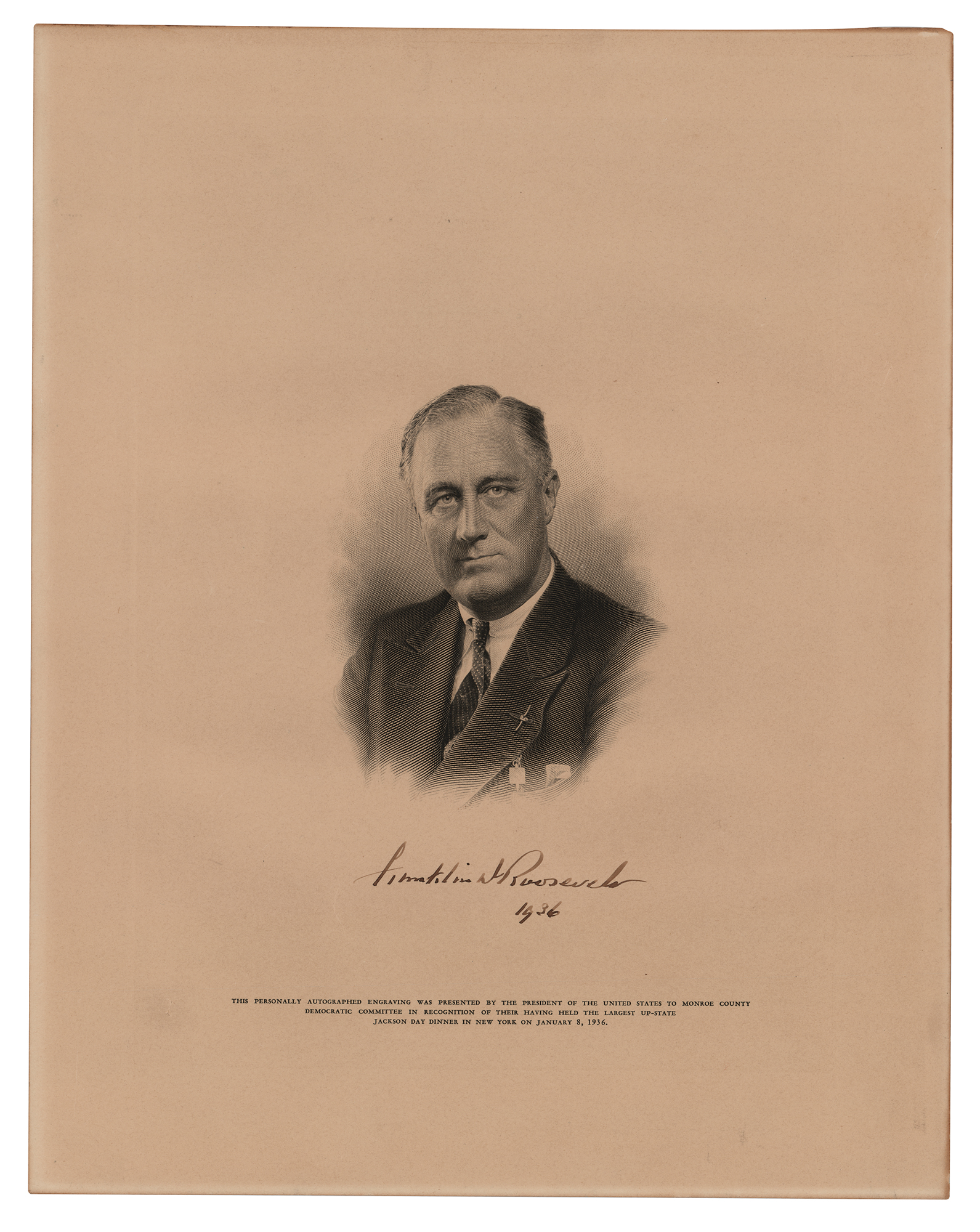 Handsome engraved portrait of President Franklin D. Roosevelt, 11 x 14, signed neatly below the image in fountain pen as president, who adds the year, “1936.” The lower caption reads: “This Personally Autographed Engraving Was Presented By the President of the United States to Monroe County Democratic Committee In Recognition of Their Having Held the Largest Up-State Jackson Day Dinner in New York on January 8, 1936.” In very fine condition.