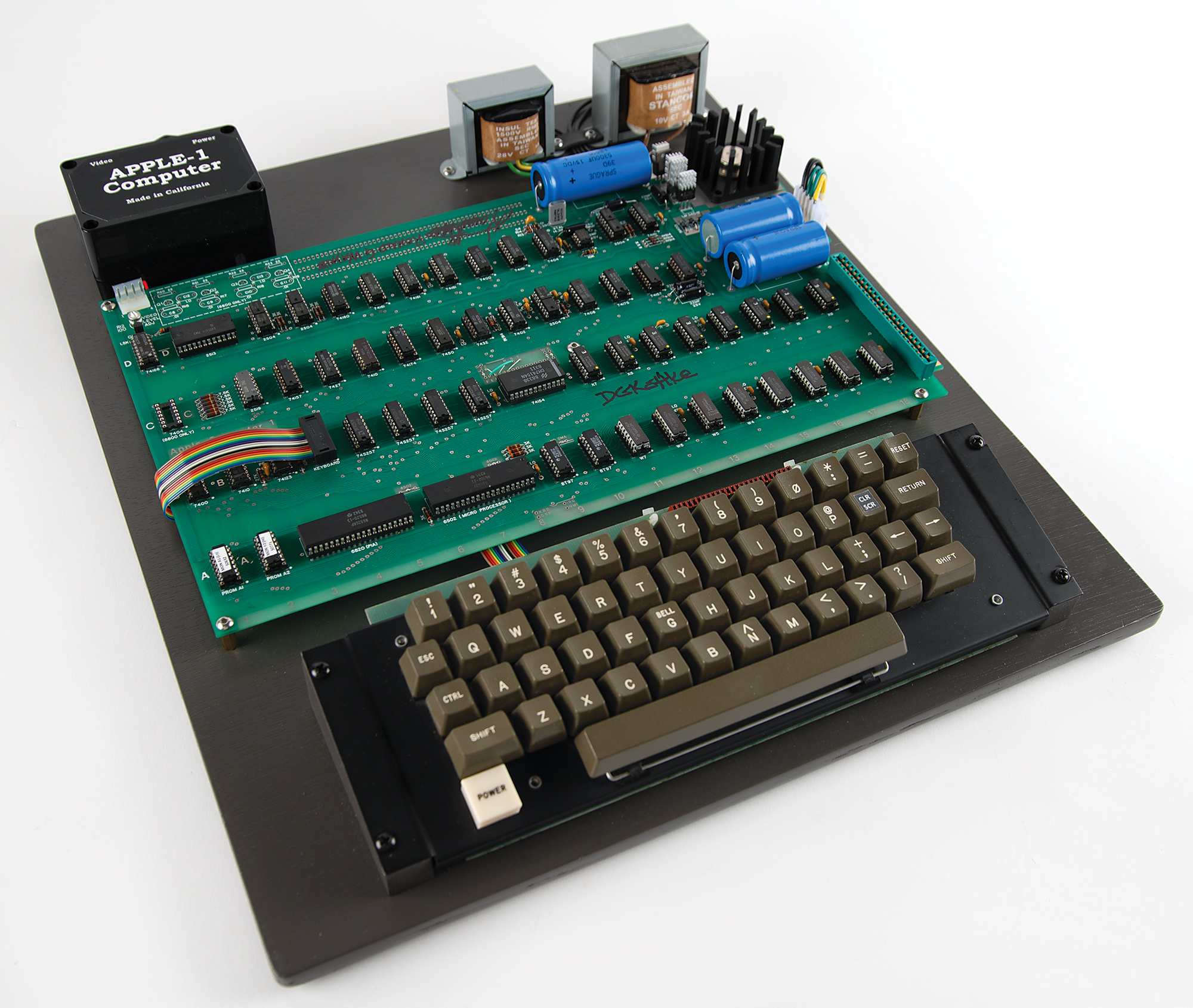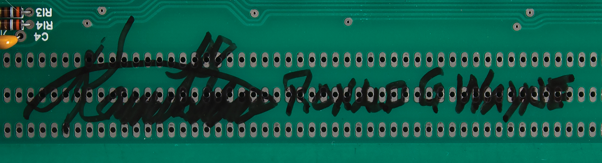 Fantastic, fully functional replica of an Apple-1 computer, measuring 15.5˝ x 9.25˝, marked "Apple Computer 1," signed on the surface of the board in black felt tip by early Apple engineer Daniel Kottke and by third Apple co-founder Ronald G. Wayne. The modern replica is an exact clone of the Apple-1, assembled with guidance from Daniel Kottke, one of Apple’s first employees, who also assembled the original batch of Apple-1 computers in Steve Jobs' garage in 1976.