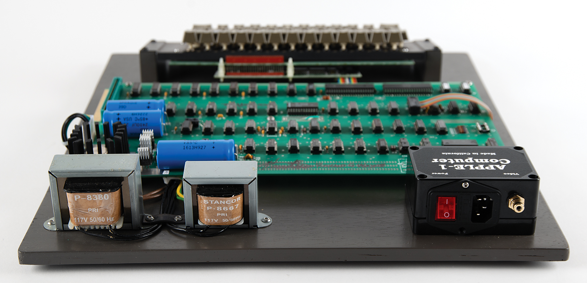 Also includes a copy of the Apple-1 operation manual, startup guide, and a provenance statement from the board's creator: "It was manufactured in the heart of Silicon Valley, the same place where it was designed and hand-soldered by Steve Wozniak in 1976. The computer is an exact replica of the original Apple-1 board, recreated with meticulous attention to detail. In addition to the circuit board, it includes a period-appropriate keyboard, a power supply built using Steve Wozniak's recommended components, a monitor, and a card reader loaded with a collection of Apple-1 programs. The overall design of this Apple-1 reflects its 1976 homebrew computer origins.