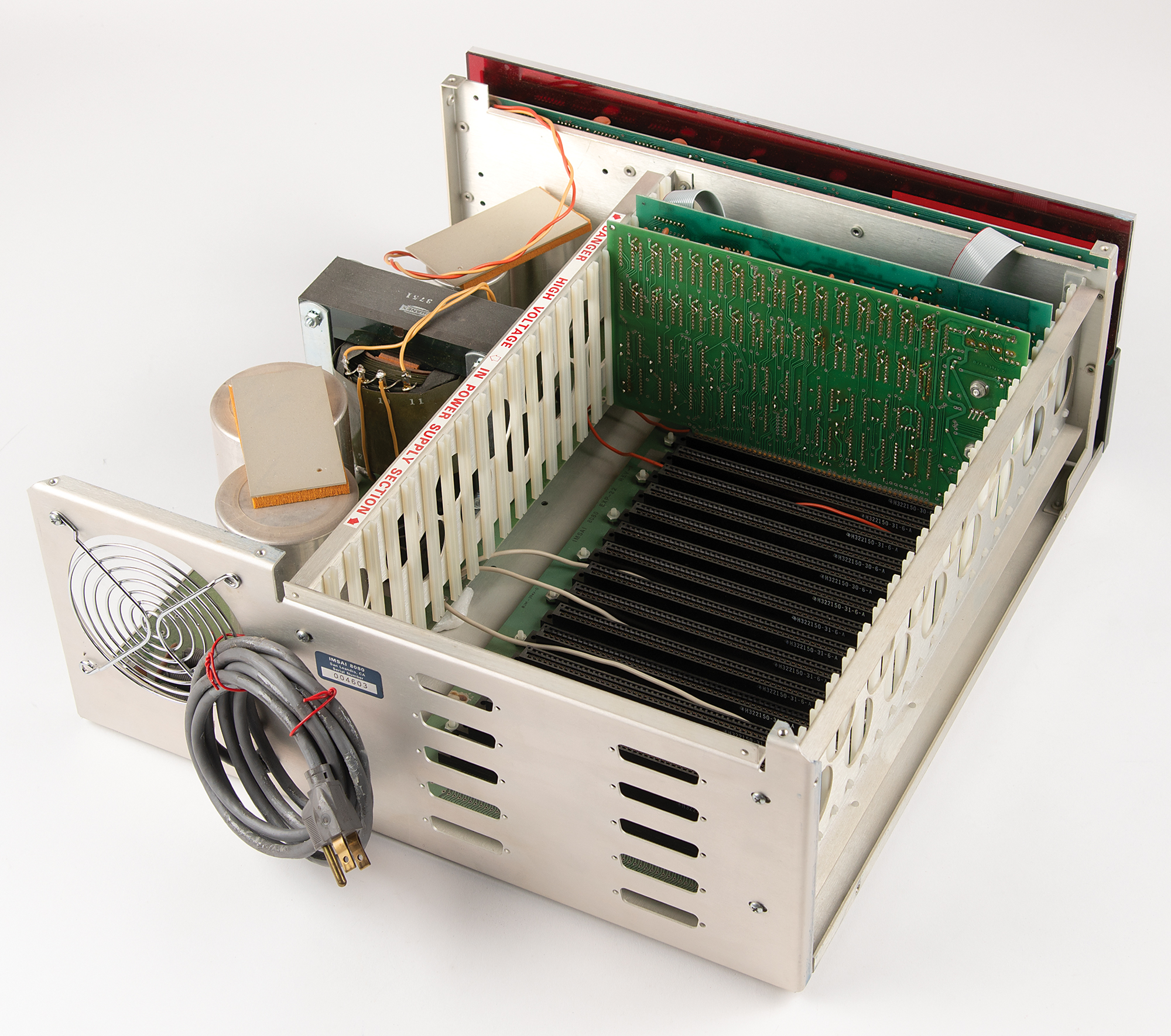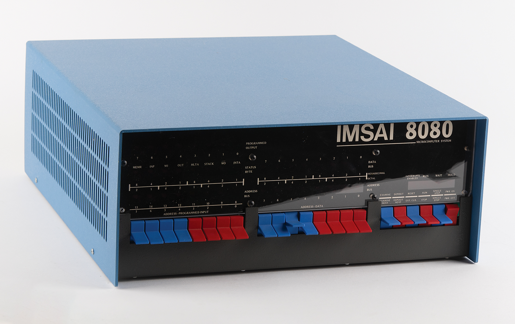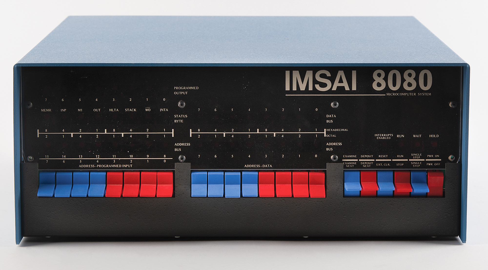 IMSAI 8080 computer, a clone of the MITS Altair 8800 microcomputer, with the manufacturer's label applied to the rear reading: "IMSAI 8080, San Leandro, CA, Serial Number 004603." Its distinctive design features a futuristic front panel with blue-and-red toggle switches and LEDs, enabling users to manually enter machine code and monitor operations. Untested and in fine cosmetic condition.
