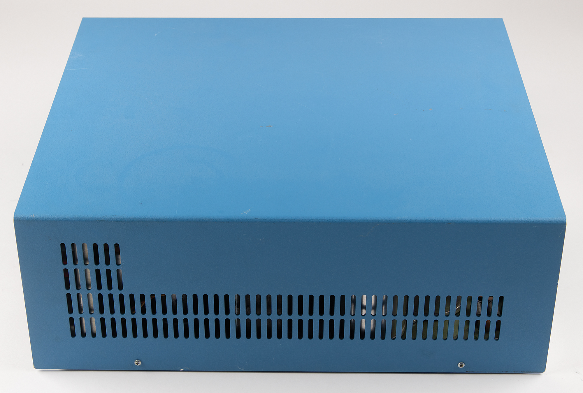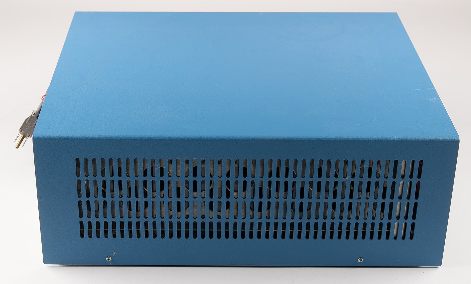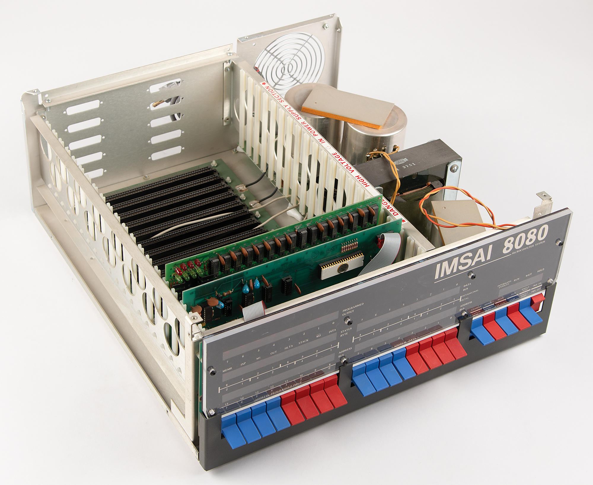 IMSAI 8080 computer, a clone of the MITS Altair 8800 microcomputer, with the manufacturer's label applied to the rear reading: "IMSAI 8080, San Leandro, CA, Serial Number 004603." Its distinctive design features a futuristic front panel with blue-and-red toggle switches and LEDs, enabling users to manually enter machine code and monitor operations. Untested and in fine cosmetic condition.