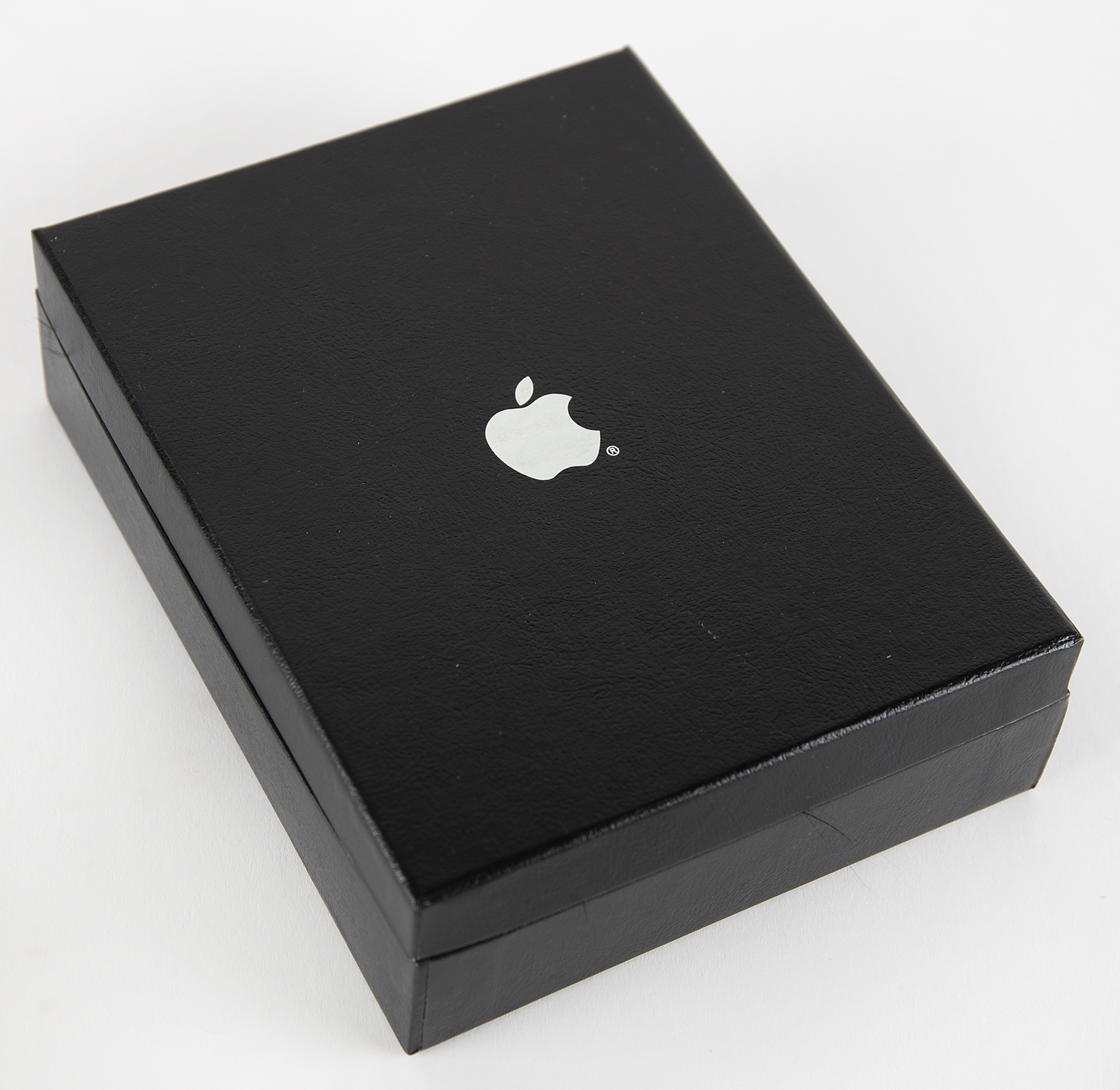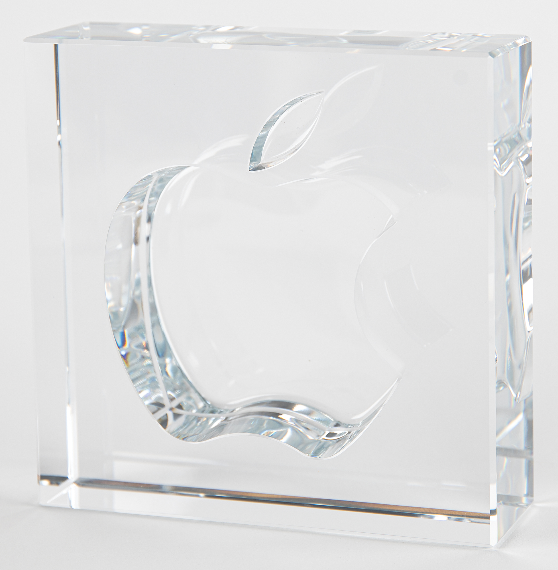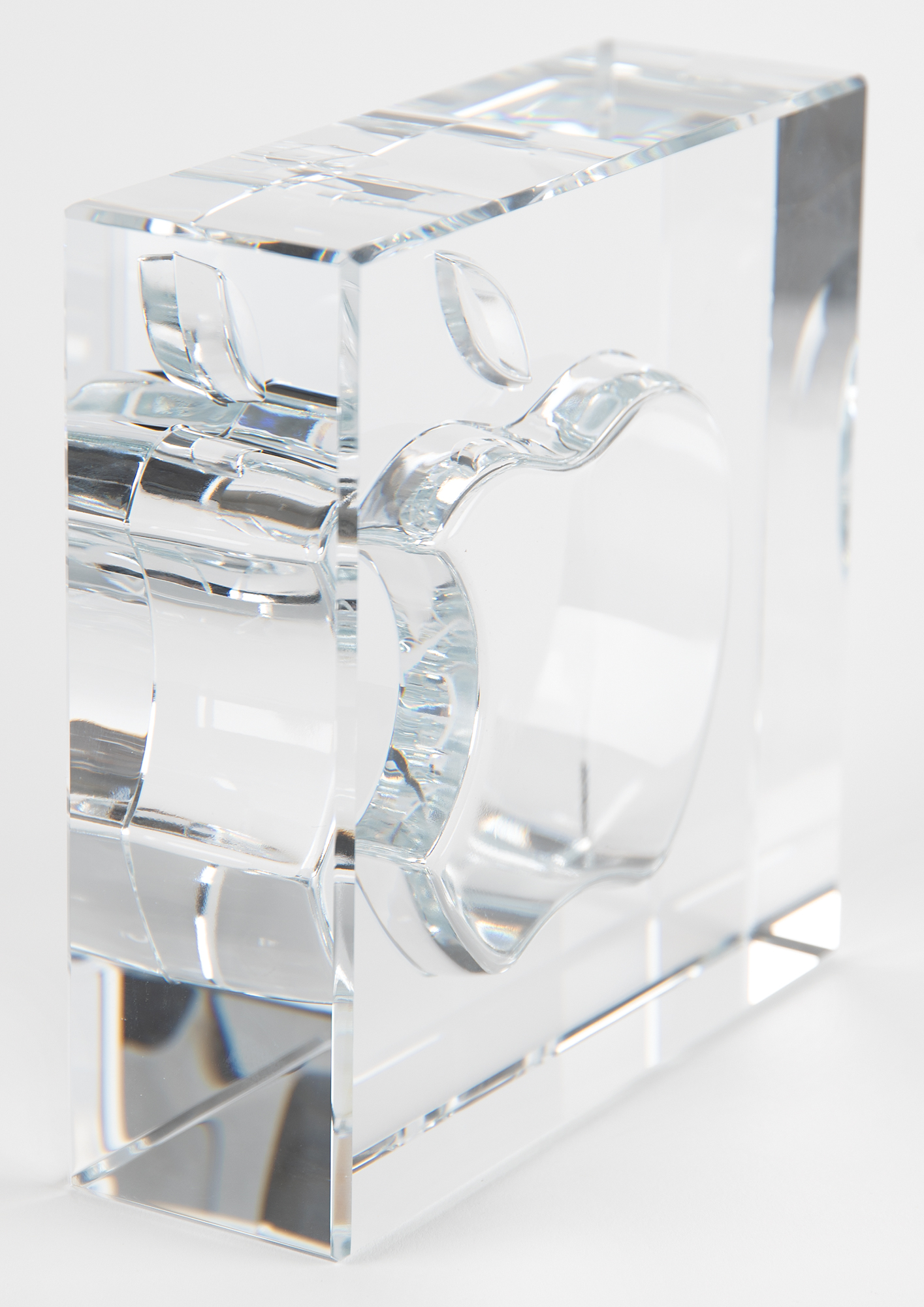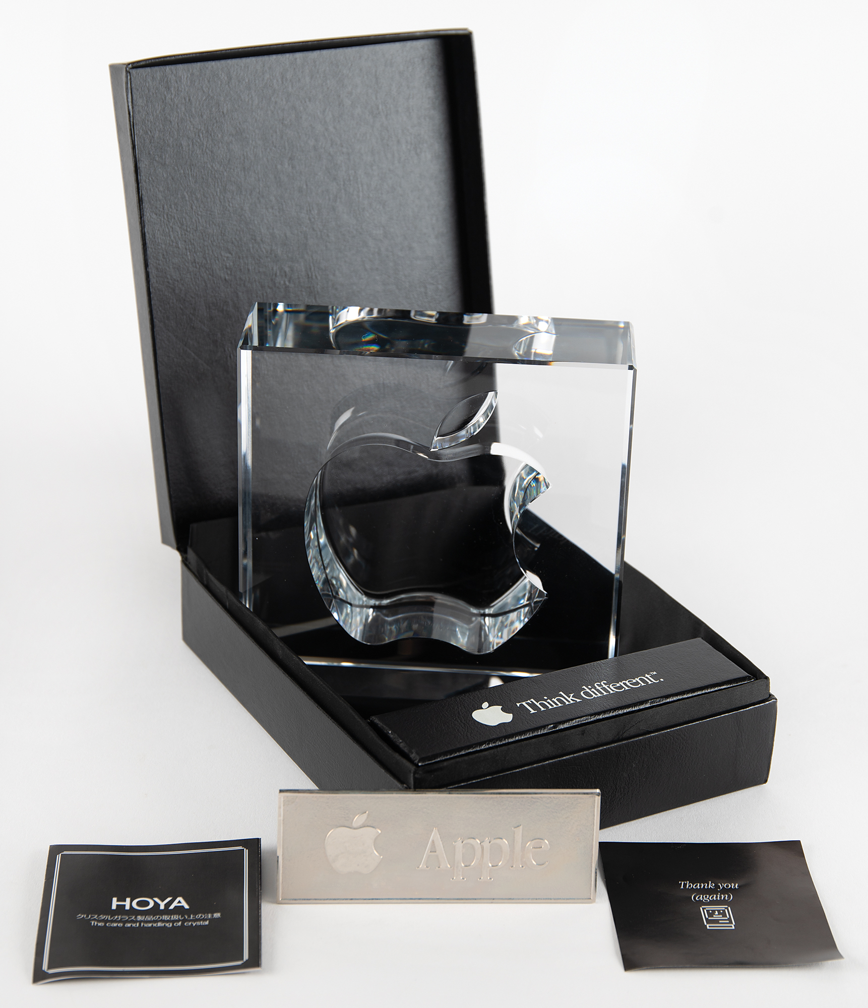 Stunning 20th Anniversary Apple Award made by the Hoya Crystal Corporation of Tokyo, Japan in 1997. This rare limited edition crystal award, which features a central, expertly cut Apple logo depression, measures 6.25˝ x 6.25˝ x 2.25˝ and weighs approximately 7.5 pounds. The award includes its original presentation box and slipcase, with Hoya ‘thank you’ card, instruction booklet, and metal plaque. In fine condition, with wear to slipcase and box.